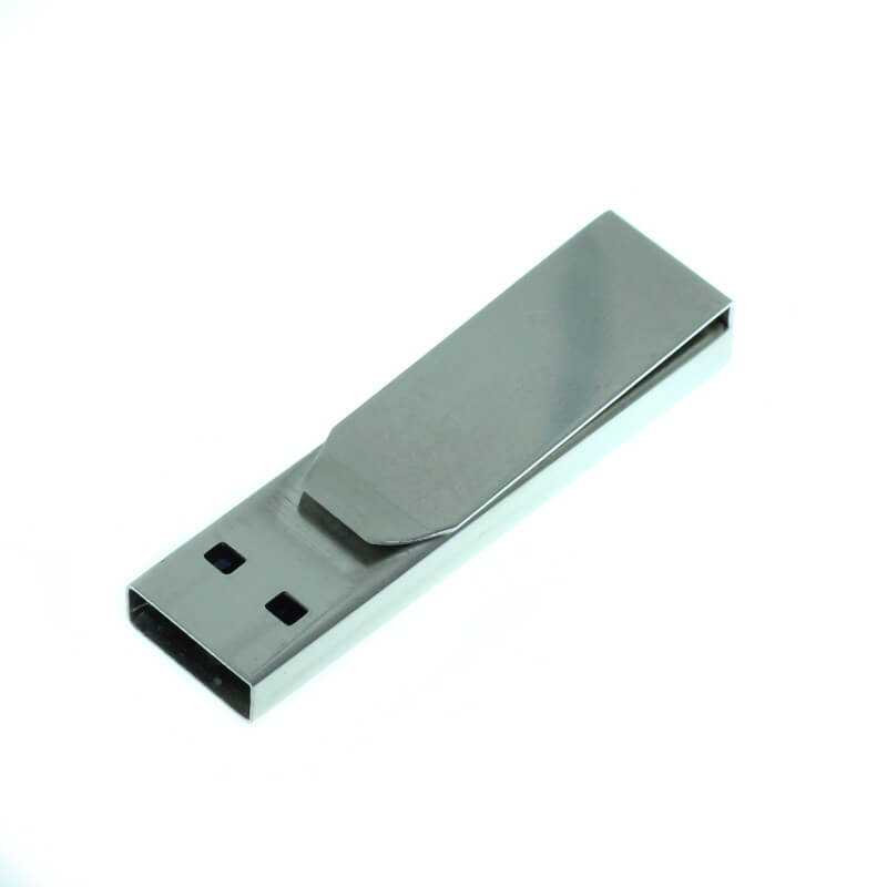 Kovový mini USB flash disk - spona. Vhodný pro potisk, nebo laser loga. Možno připojit šňůrku, kroužek, nebo karabinku.