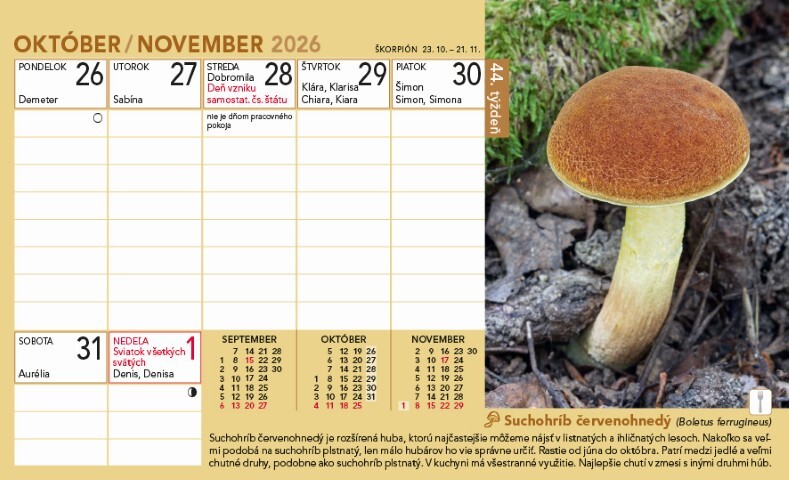 Nepostradatelný společník pro všechny milovníky lesů a hub! Tento stolní kalendář obsahuje týdenní fotografie hub, doplněné zajímavými informacemi, popisy a praktickými radami pro houbaře, včetně tipů na sběr, období výskytu.