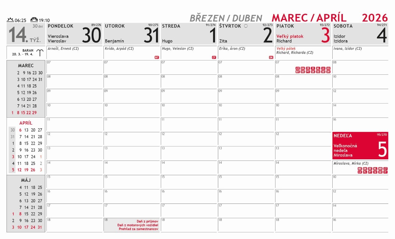 Formát MAXI - maximální přehled o vašem čase a povinnostech. Tento přehledný stolní kalendář ve větším formátu obsahuje: časový fond pro snadné plánování, daňový kalendář se zvýrazněnými daty, školní kalendář se začátky a konci prázdnin, svátky EU, roční období, roční přehled na roky 2026 a 2027. Díky přehlednému uspořádání a velkému prostoru pro poznámky je ideální pro kanceláře, firmy k efektivnímu a přehlednému plánování.