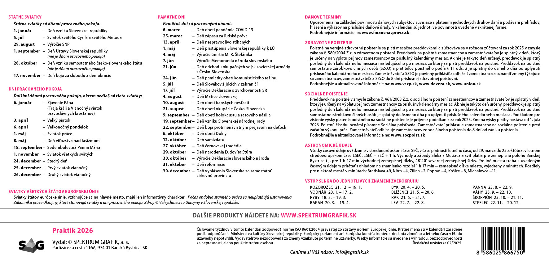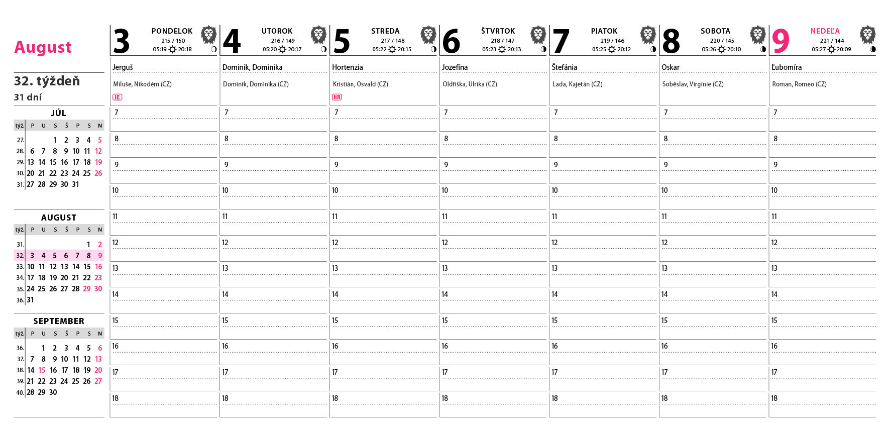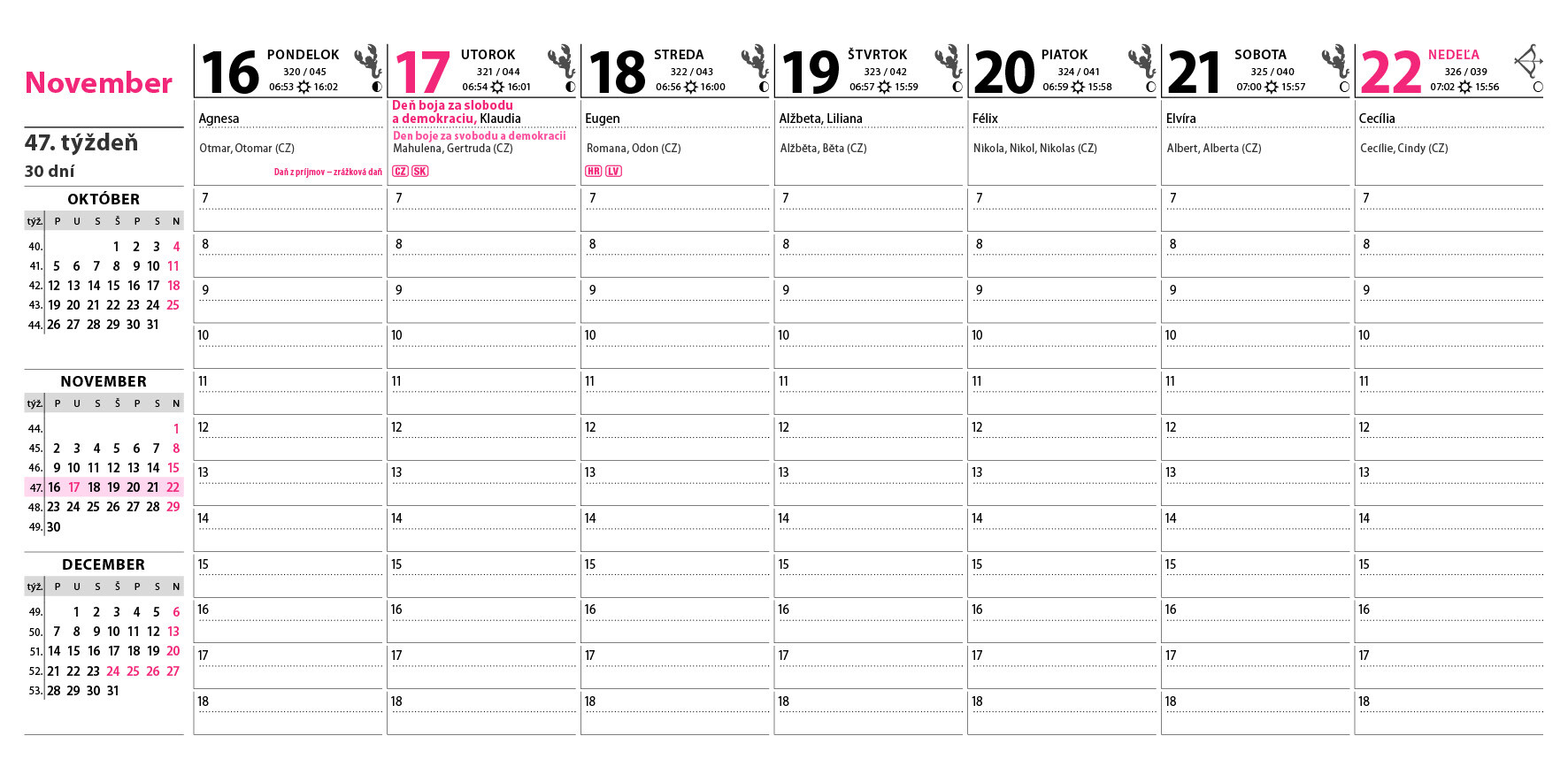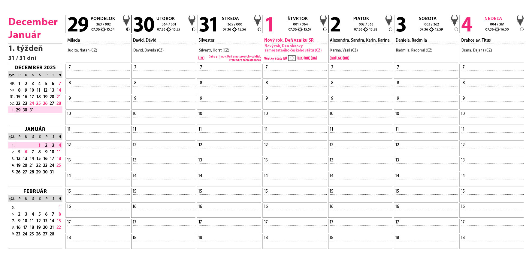 Praktický sloupcový kalendář s přehledem nadcházejících měsíců na levé straně. Dostatek místa pro plánování celého týdne. Obsahuje daně, svátky EU, východy a západy slunce, fáze měsíce.