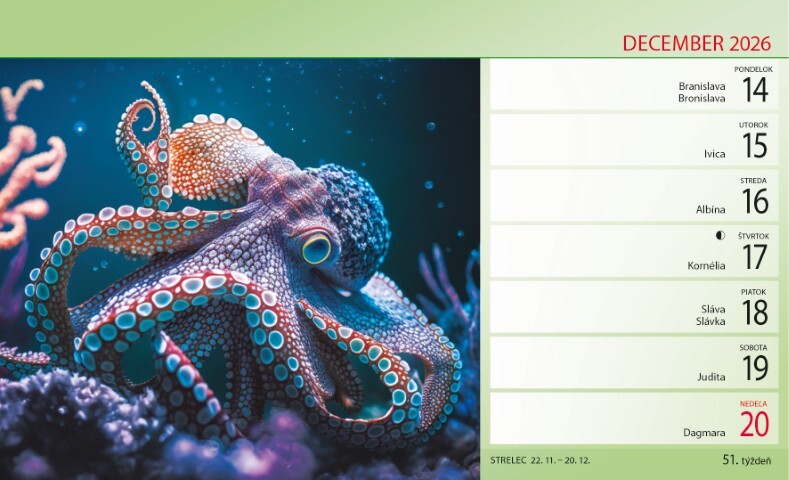 Týdenní stolní kalendář Wild Life vám každý týden přináší úchvatné fotografie zvířat z celého světa: od majestátních šelem a tajemných obyvatel lesů až po drobné detaily života v divočině. Každá fotografie zachycuje jedinečný okamžik ze světa zvířat. Kalendář je ideální pro milovníky zvířat, dobrodruhy a všechny, kteří si chtějí ozdobit svůj pracovní stůl kouskem divočiny.