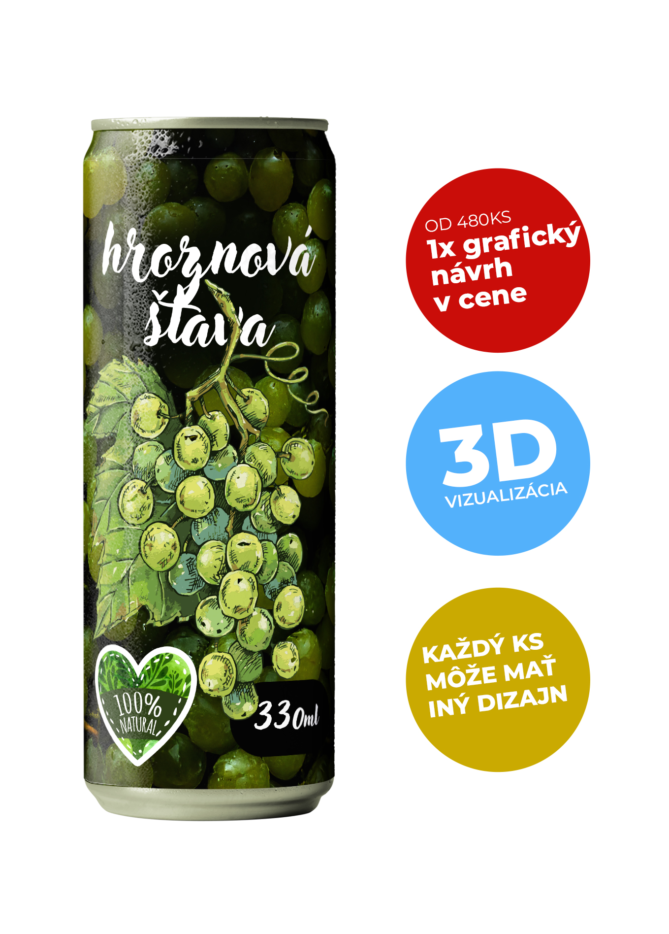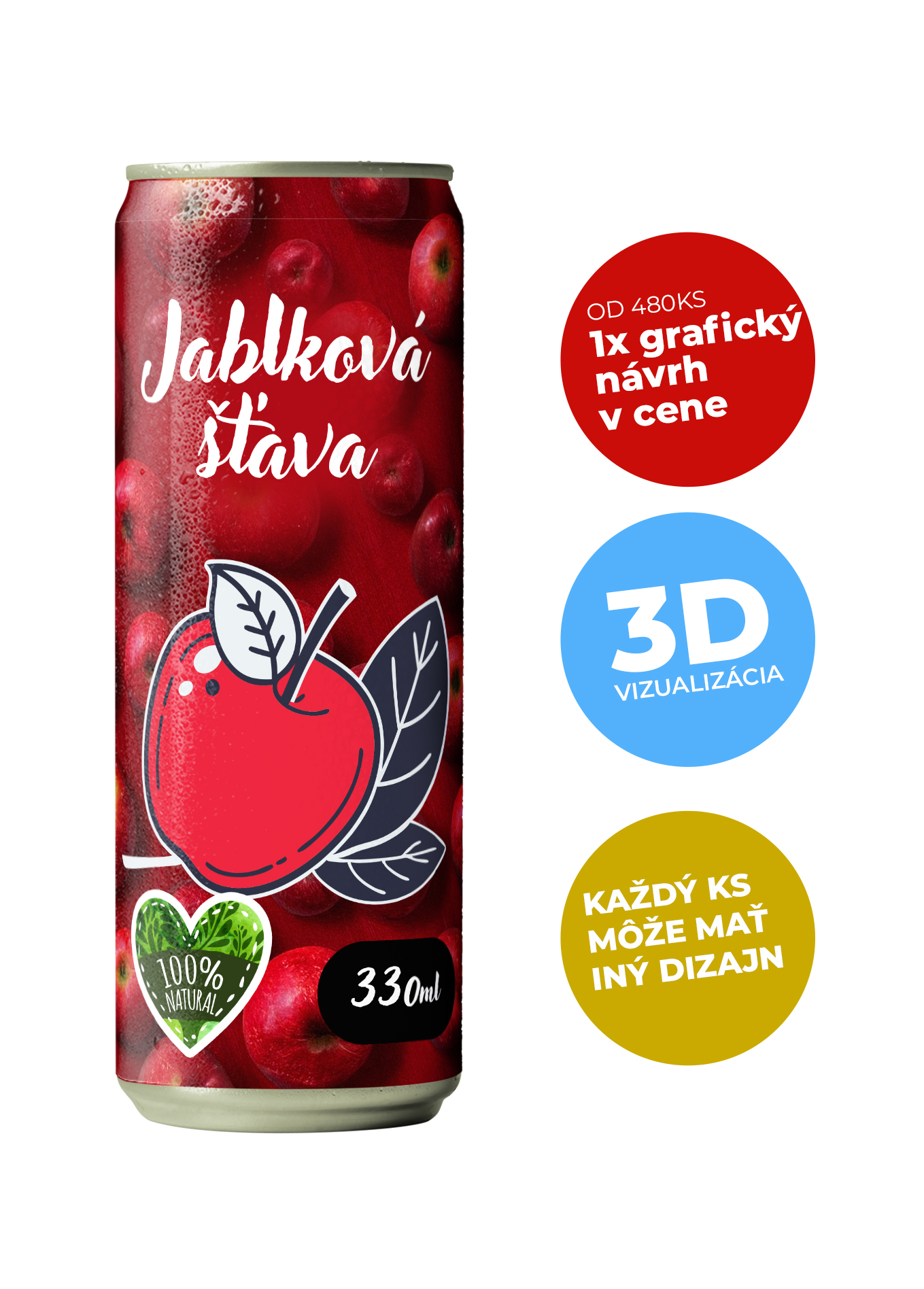 Čerstvo lisovaná šťava v plechovke s vlastnou potlačou (330 ml) – jablko/broskyňa/hrozno