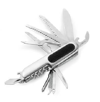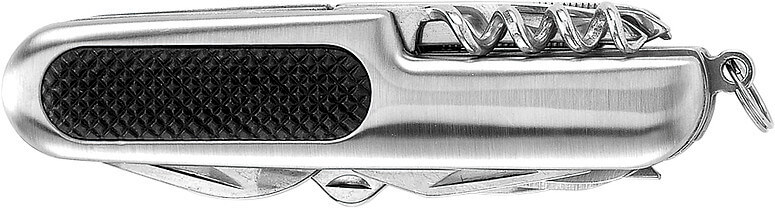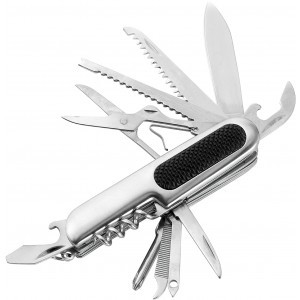 Nôž vreckový z nerezovej ocele s 11 funkciami. Zahŕňa otvárač na fľaše, otvárač na konzervy / plochý skrutkovač, vývrtku, skrutkovač Philips, dve píly, nožnice, dva malé nože, veľký nôž a ohýbač drôtu.