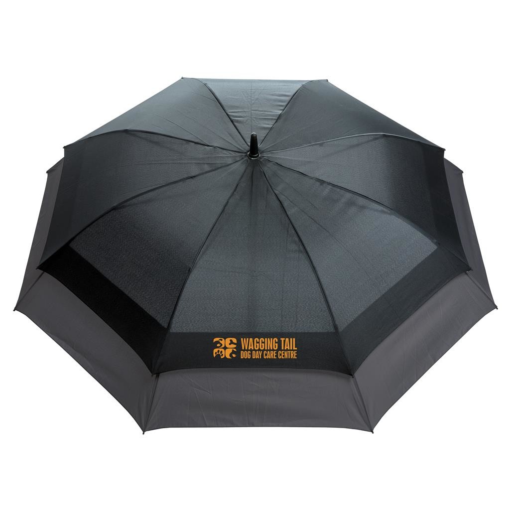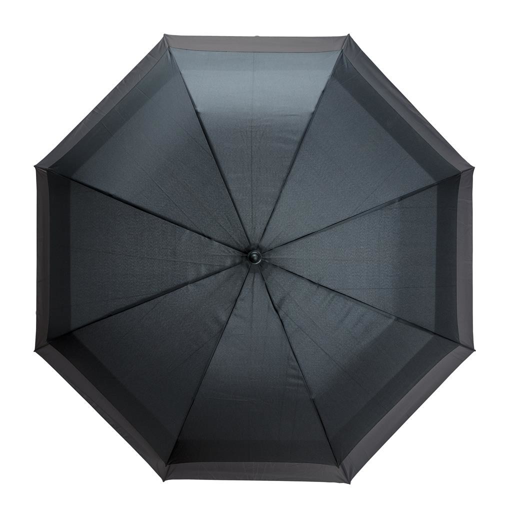 Unikátne prevedený dáždnik, ktorý v zloženom stave zaberá miesto ako 23" a po otvorení sa rozšíri na veľkosť 27", ideálnu pre 2 osoby. Automatické otváranie, manuálne zatváranie. Kovová tyč, rebrá zo sklolaminátu odolné silnému vetru, koncovky z PP, matné čierne madlo. Vyrobené z recyklovaného polyesteru 190T pongee vrátane skenovateľnej zložky AWARE™ garantujúce obsah recyklátu. 2 % z výnosov z každého predaného kusu je prispených na iniciatívu Water.org.