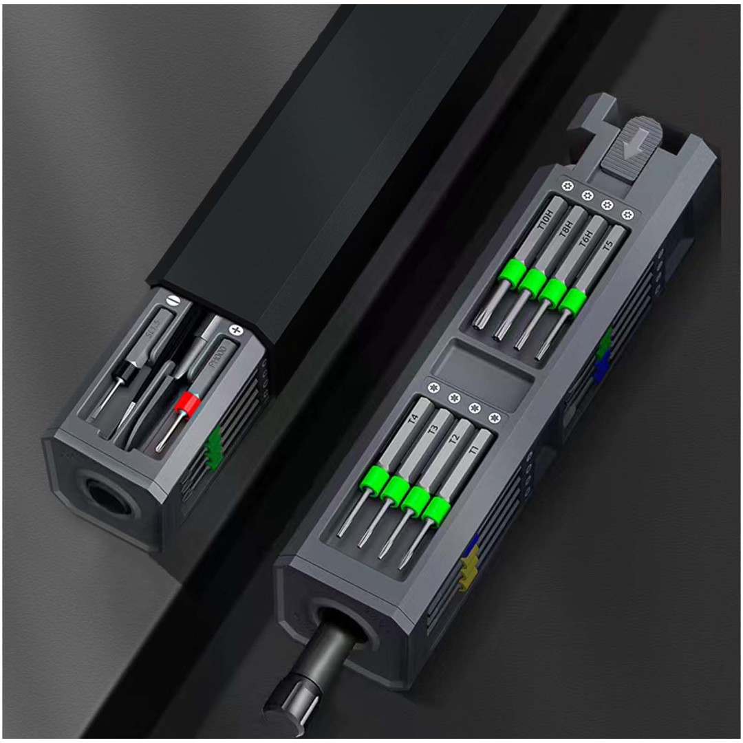 30-dielna sada presných skrutkovačov s 28 bitmi a dvoma doplnkami. Puzdro z oxidovaného hliníka (15 x 3,6 x 3,6 cm) je možné personalizovať vyrytým logom. Kompaktné puzdro uľahčuje uloženie všetkého na jednom mieste. Ručný skrutkovač je ideálny na opravu akéhokoľvek malého zariadenia a vďaka svojmu tvaru sa ľahko používa aj ovláda. Je vybavený širokou škálou bitov, takže je univerzálny pre mnoho typov kutilských činností. Každý typ bitu je označený inou farbou, aby ho bolo možné ľahko identifikovať. Bity sú magneticky pritiahnuté k skrutkovaču. Súčasťou sady je aj pinzeta na vyberanie drobných predmetov a páčidlo na zdvíhanie a otváranie puzdier. Balené v darčekovej krabičke (17 × 55 × 43,5 cm) s magnetickým uzáverom. Záruka 3 roky.