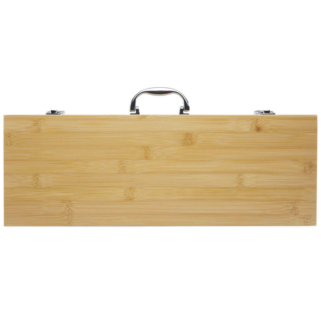 Bambusová trojdielna grilovacia sada s naberačkou (42 × 9,5 cm), kliešťami (46 × 2,2 cm) a vidlicou (43 × 3,2 cm). Sada je dodávaná v bambusovej darčekovej krabičke (51,5 × 18,2 × 7,2 cm). Rukoväte a darčeková krabička sú vyrobené z bambusu, ktorý sa získava a vyrába v súlade so zásadami udržateľnosti.