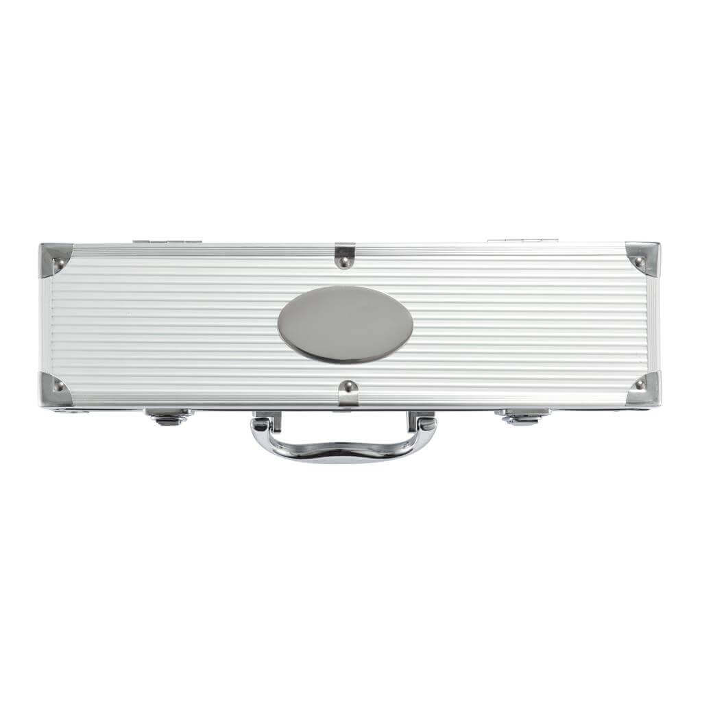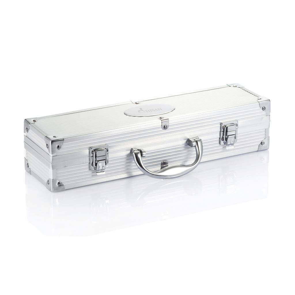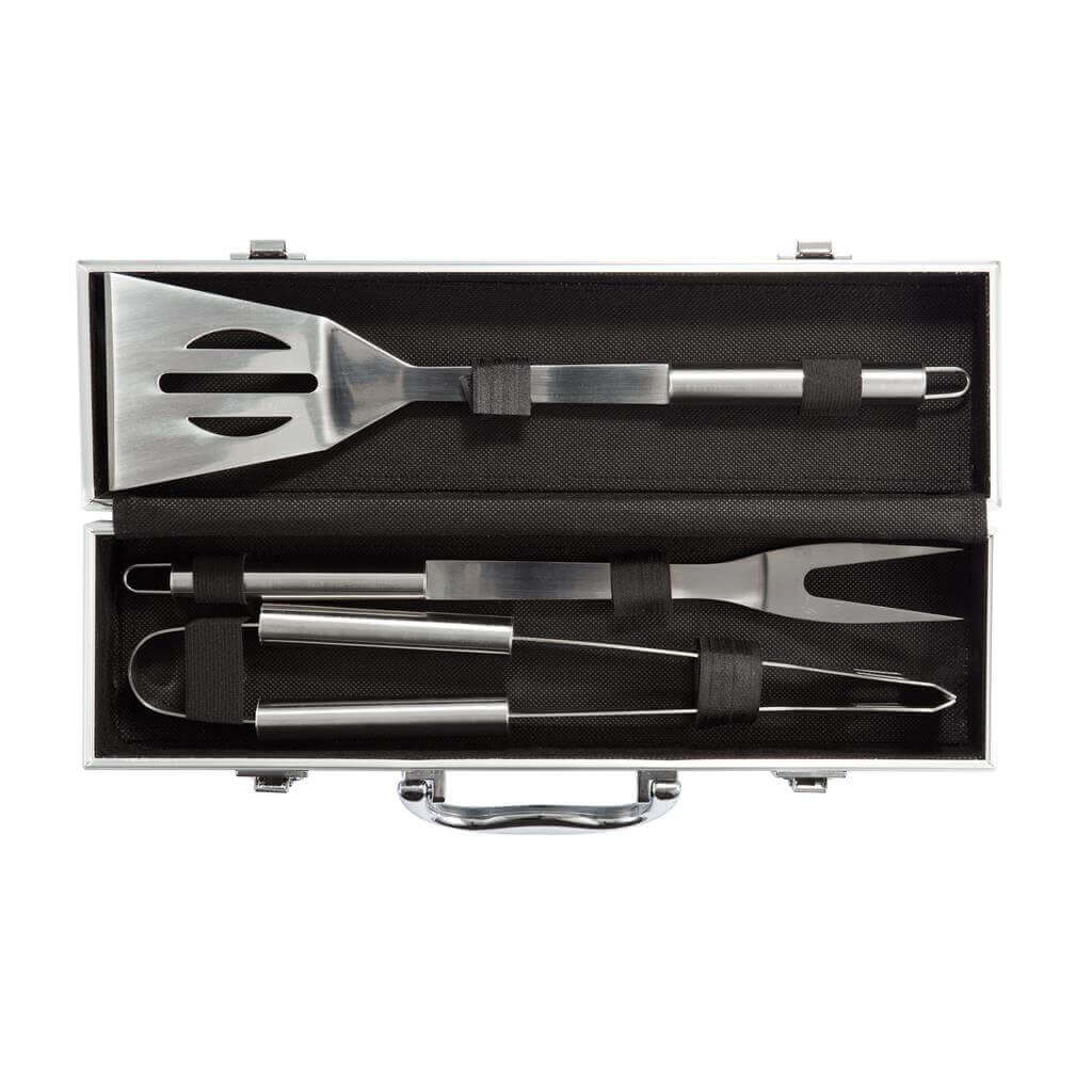 3dielna sada nástrojov na grilovanie z nerez ocele, vrátane obracačky, porciovanie vidličky s ochrannou krytkou, a klieští. Rukoväť z nerez ocele. Všetko uložené v hliníkovom kufríku s pántmi a uchom.