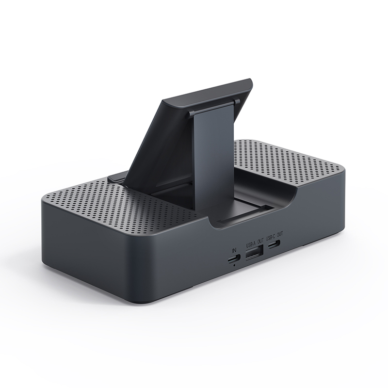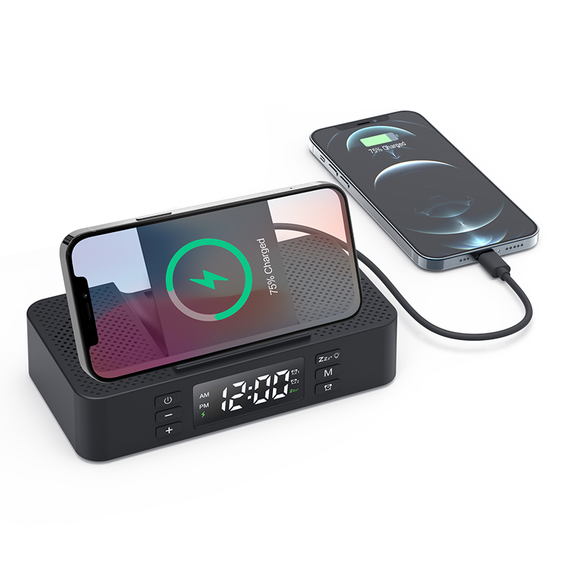 Vítané multifunkčné zariadenie na nočný stolík - digitálne hodiny s budíkom, bezdrôtová nabíjačka zabudovaná v nastaviteľnom stojane na mobilný telefón a stereo reproduktor s výkonom 2 × 3 W. Pred spaním tak môžete počúvať svoje obľúbené skladby alebo podcast, prípadne sledovať videá na displeji mobilného telefónu z pohodlia postele. Zároveň sa váš telefón na stojane bezdrôtovo nabíja s podporou 15 W rýchleho nabíjania a prostredníctvom kábla USB môžete nabíjať ďalší mobilný telefón alebo inú elektroniku. O verný zážitok z počúvania sa postará reproduktorová sústava s dvoma stereofónnymi výškovými a dvoma basovými reproduktormi. Minimálny odber 50ks.