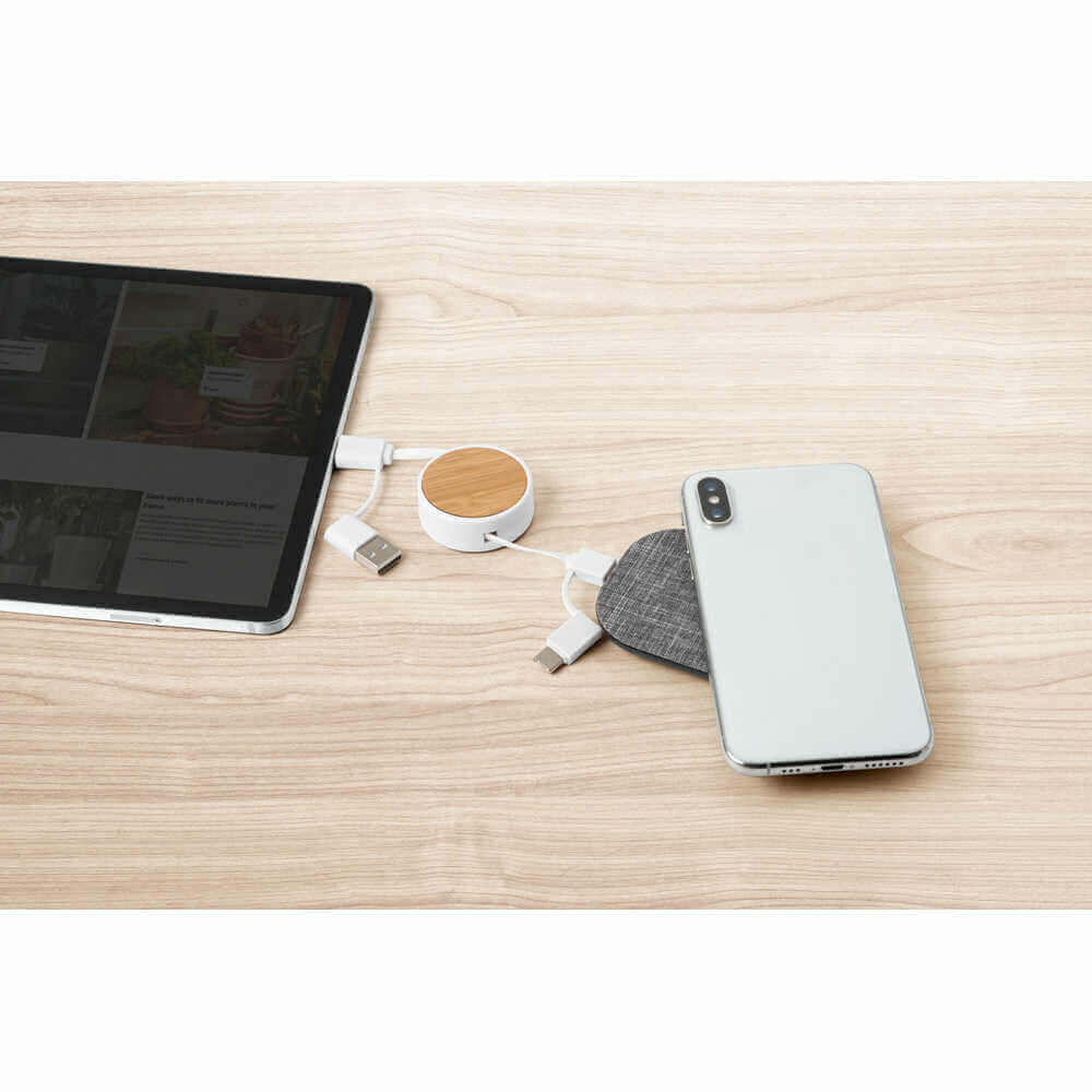 Zatiahnuteľný 5v1 ABS a bambusový kábel. Jeden koniec je USB-C s adaptérom pre USB-A, zatiaľ čo druhý koniec má špeciálny micro-usb a iOS tip 2 v 1 (rýchlo-nabíjací) s adaptérom pre USB-C. Vstup/výstup: 5V/1A. Dodávané v papierovej krabičke.48 x 130 mm | Natiahnutý kábel: 40 x 850 mm