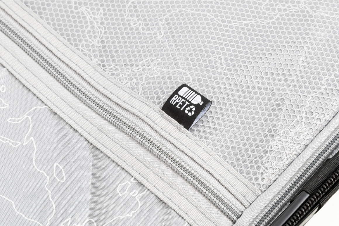 20-palcová príručná taška na kufor z tvrdého materiálu z RPET so 4 kolieskami, teleskopickou rukoväťou a kombinovaným zámkom TSA. S RPET vnútornou podšívkou a elastickými popruhmi. Nosnosť vaku je 15 kg. S kovovou doštičkou na gravírovanie loga