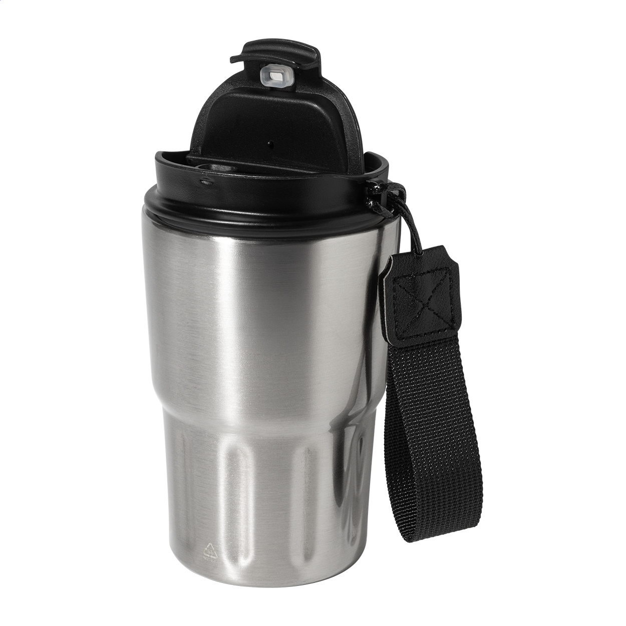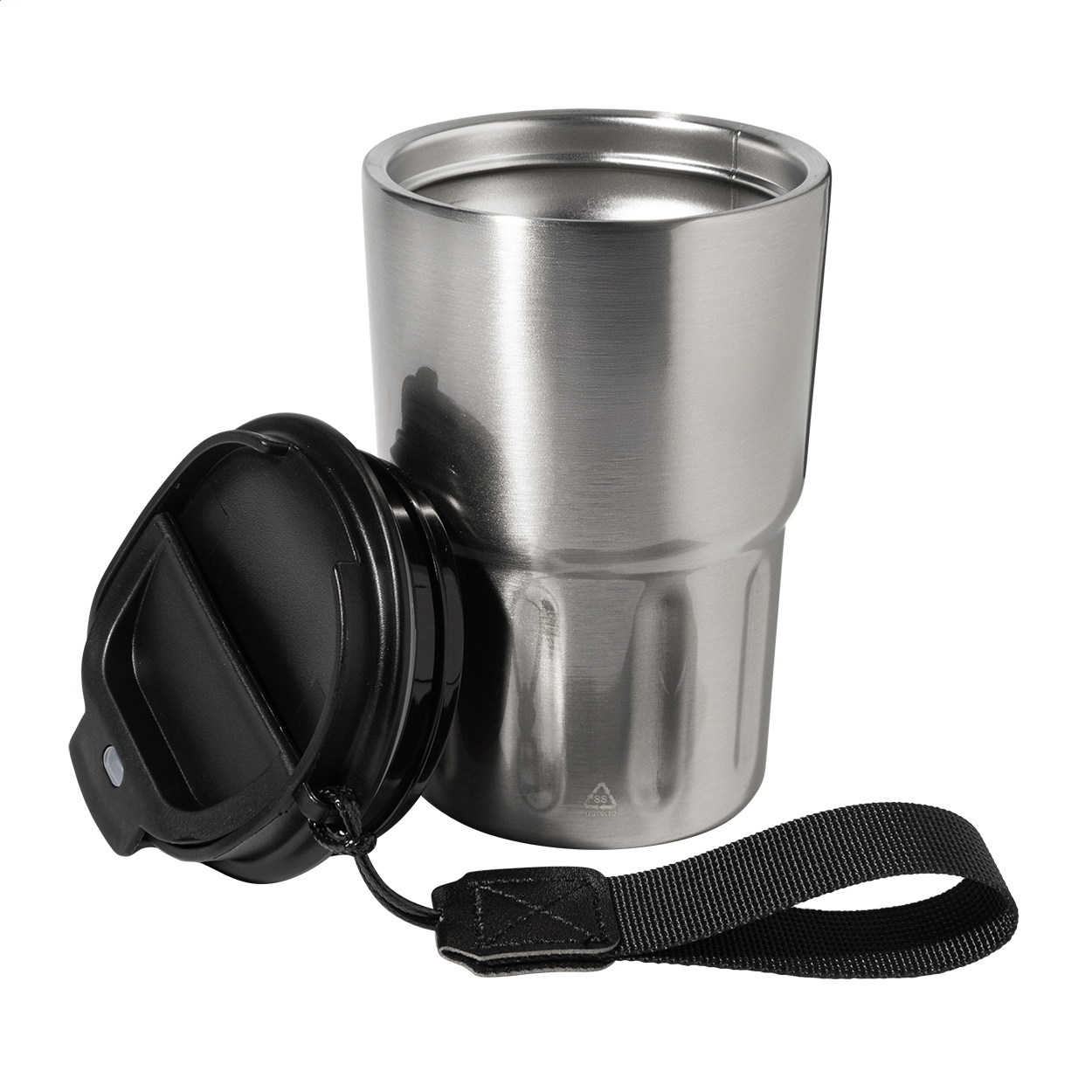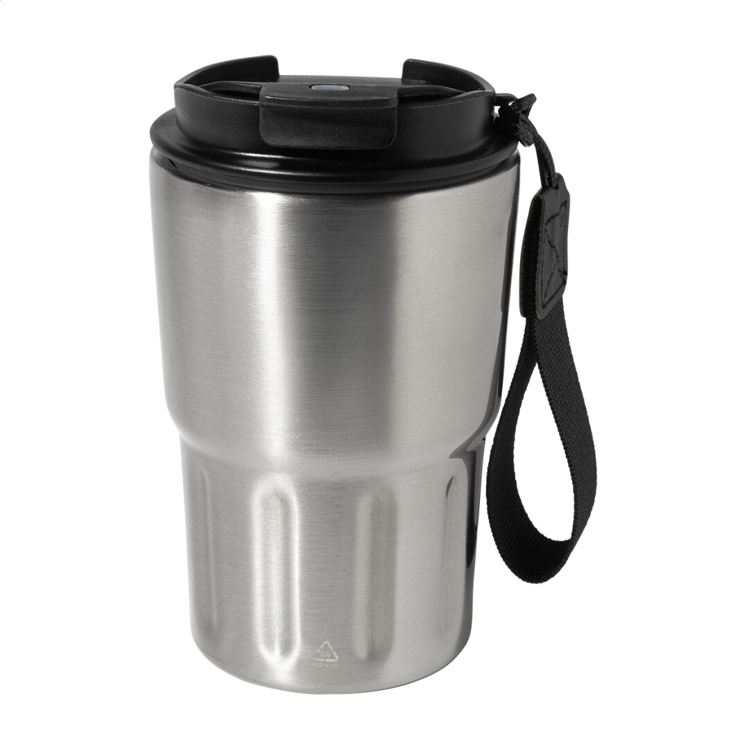 Dvojstenný termo hrnček z recyklovanej nerezovej ocele s izolačným viečkom z PP. S pútkom z RPET polyesteru. 350 ml. New. Go Green. Vhodné do umývačky riadu: Nie. Vhodné do mirkovlnnej rúry: Nie. Typ steny: Dvojitá stena. Typ izolácie: Vákuová izolácia. Doba izolácie za studena: 10 hodín. Doba izolácie za horúca: 6 hodín. Odolné voči poliatiu / nepriepustné: Odolné voči poliatiu
