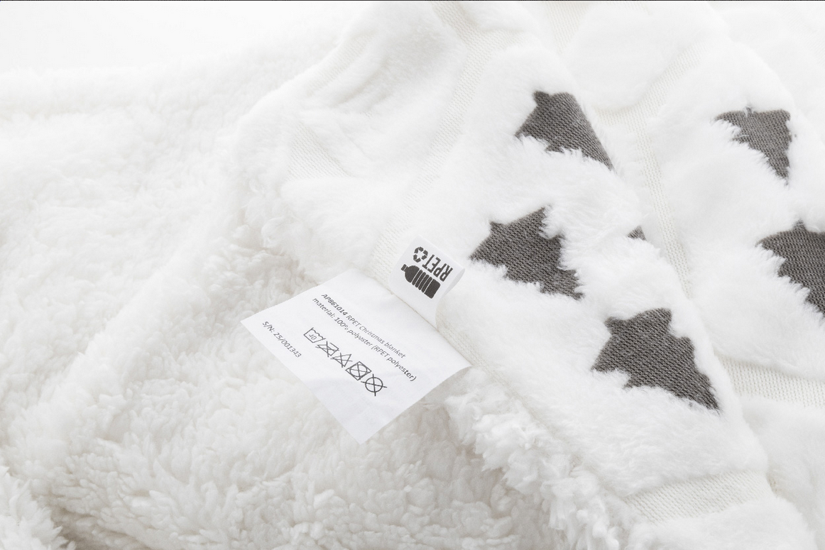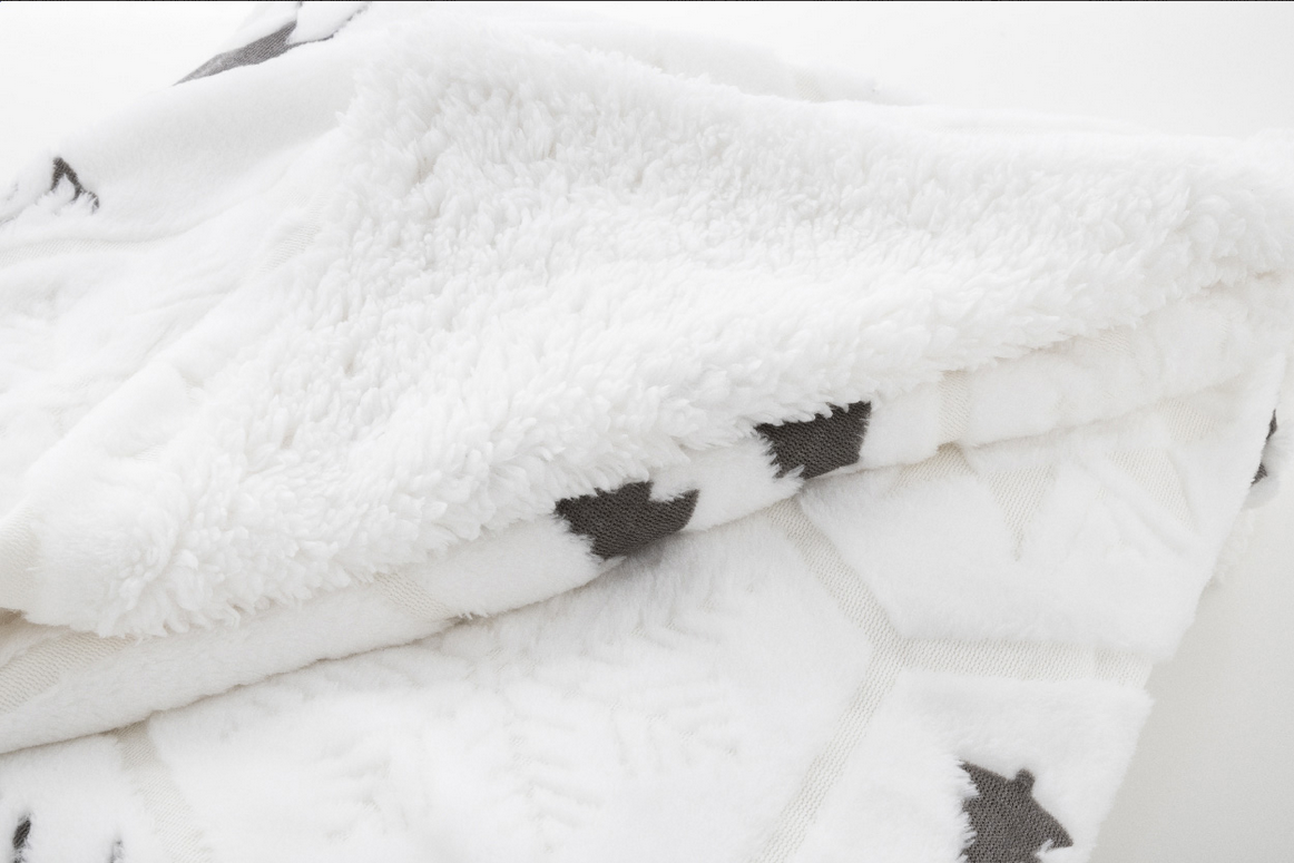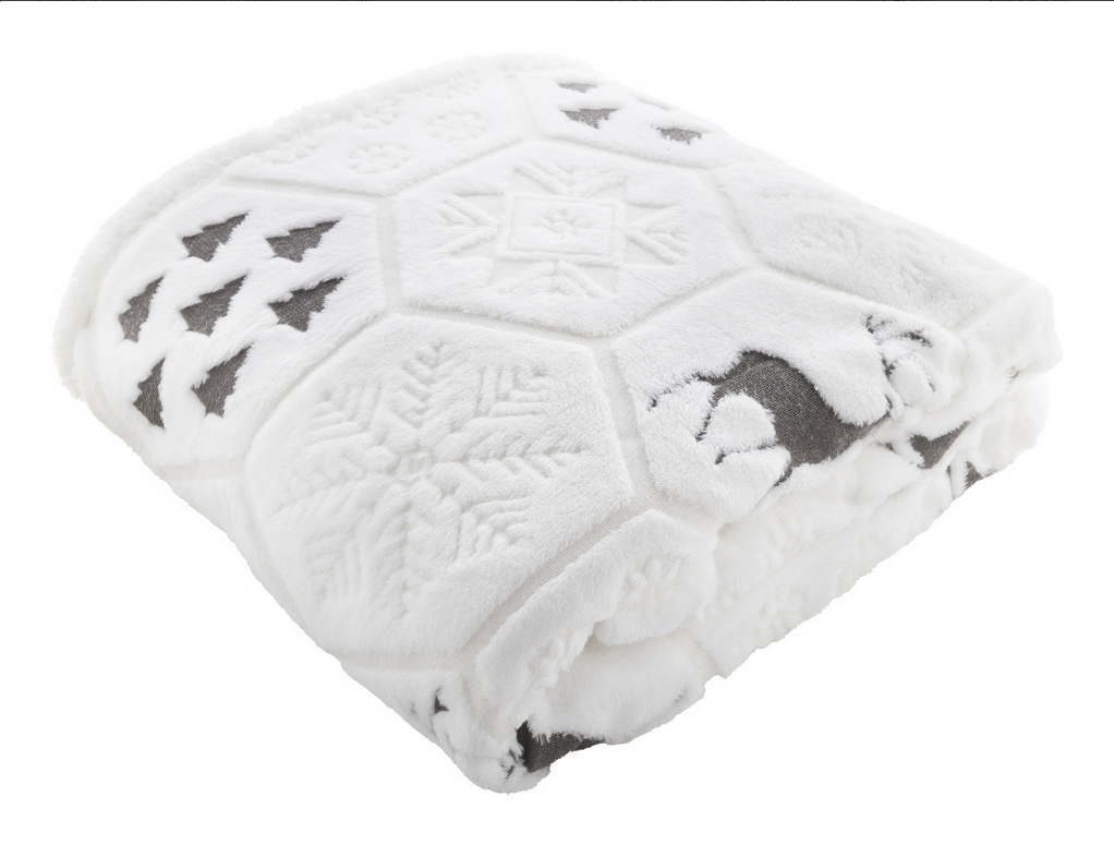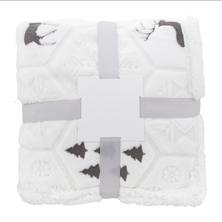 Luxusná dvojvrstvová vianočná deka z RPET s reliéfnym zimným vzorom. S flanelovým fleecovým materiálom RPET 270 g/m² a obojstrannou podšívkou z RPET sherpa fleecu 210 g/m². Zabalené do stuhy a tlačiteľného papierového kartónu.