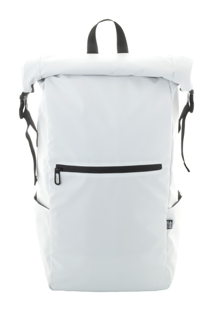 Vodotesný rolovací batoh z RPET so zapínaním na pracku a suchý zips, polstrovaná priehradka na notebook (16") a tablet (10"), predné vrecko na zips, bočné vrecká, polstrovaný chrbát a ramenné popruhy. Polyester 600D RPET potiahnutý PU, s výrazným štítkom RPET.