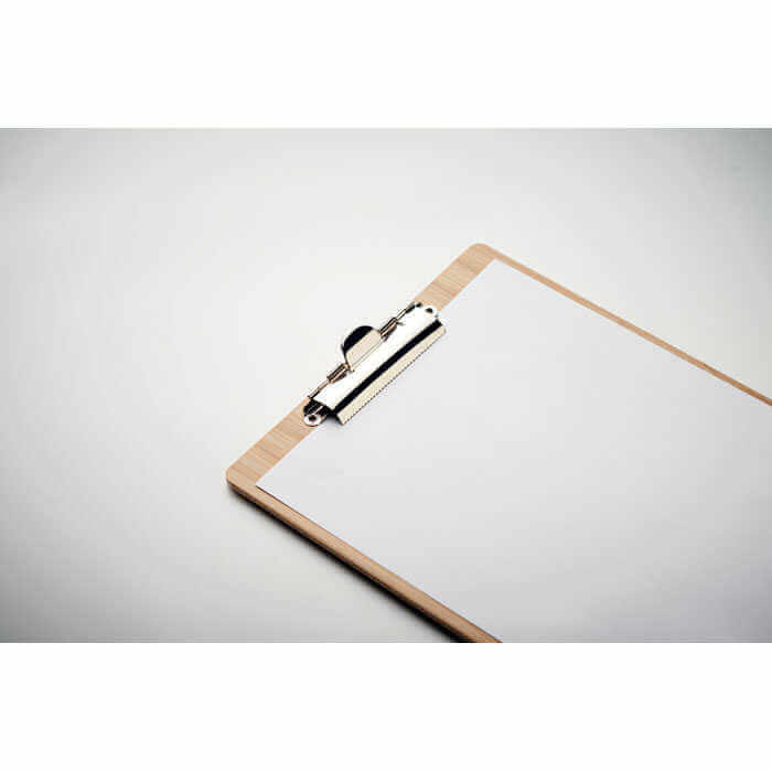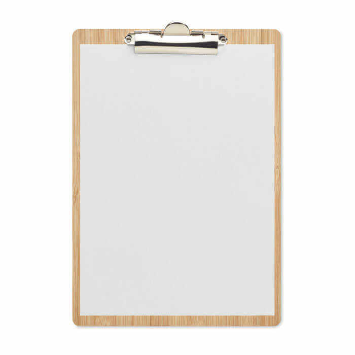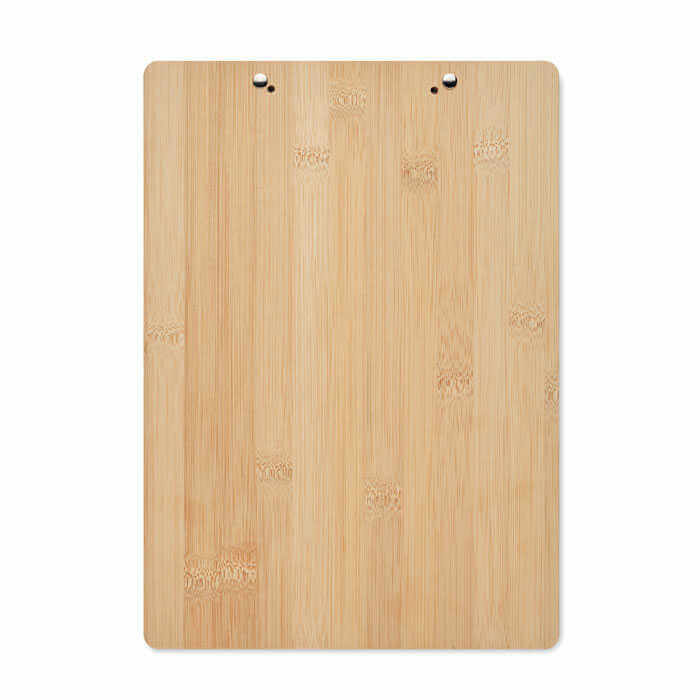 Bambusová podložka na dokumenty s klipom formátu A4. S touto užitočnou kancelárskou pomôckou budete mať všetku prácu prehľadne usporiadanú a už nikdy nestratíte žiadny dôležitý dokument. Bambusový materiál mu dodáva prírodný vzhľad a je oveľa lepšou alternatívou k bežným plastovým. Bambus je prírodný materiál, pri každom jednotlivom kuse sa môžu vyskytnúť drobné odchýlky vo farbe a veľkosti, ktoré môžu mať vplyv na finálnu podobu potlače.
