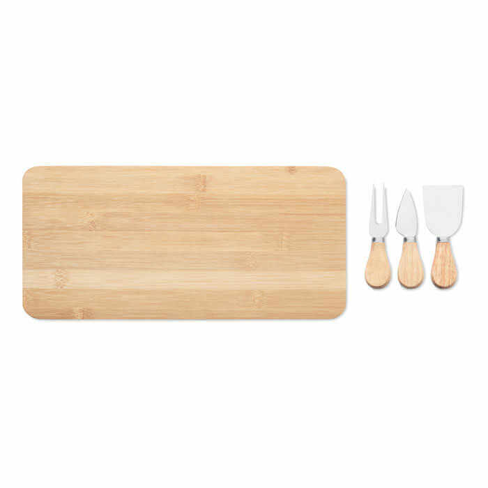 Bambusová sada na syr so servírovacou doskou, dvoma servírovacími nožmi a vidličkou. Servírujte vaše obľúbené syry s touto drevenou doskou prírodného vzhľadu a zodpovedajúcim náradím štýlovo. Možno použiť aj na servírovanie iných druhov potravín a občerstvenia na večierkoch alebo pri večeri. Bambus je prírodný materiál, pri každom jednotlivom kuse sa môžu vyskytnúť drobné odchýlky vo farbe a veľkosti, ktoré môžu mať vplyv na finálnu podobu potlače. Veľkosť 37,5 x 17,5 x 1,5 cm.
