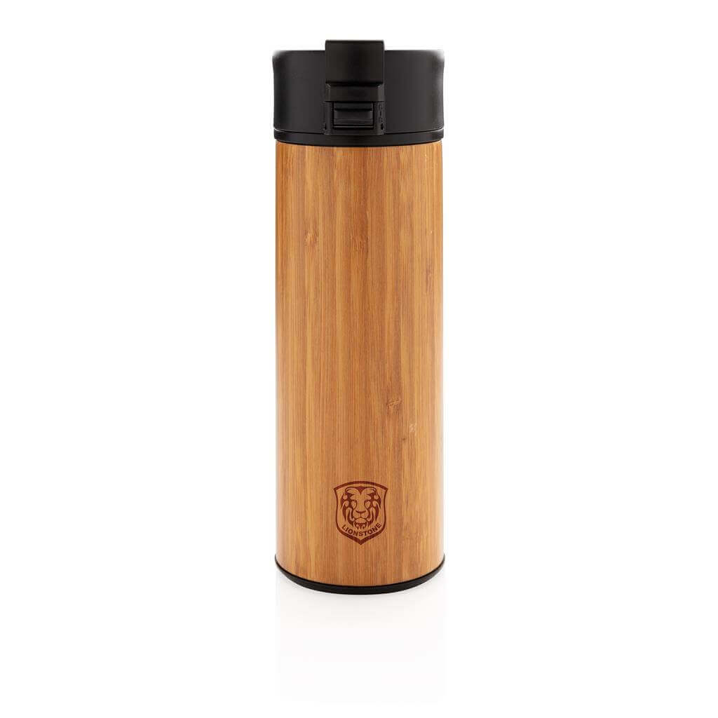 Ideálny termohrnček stvorený pre každodenné použitie. Dostatočne odolný k outdoorové turistike, napriek tomu nesmierne elegantný pre použitie v kancelárii. Bambus dodáva nadčasový vzhľad a pohodlný úchop. Uzamykací nepriepustné viečko možno ovládať jednou rukou. Nehrdzavejúca oceľ 304 SS zvonka a 201 SS vnútri. Nápoje udrží až 5h horúce a 15h studené. Objem: 450 ml. ochranný vzor®