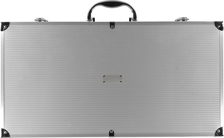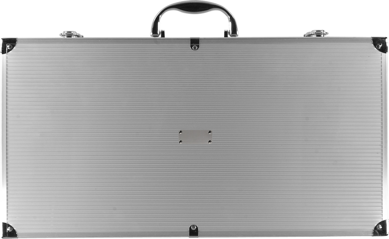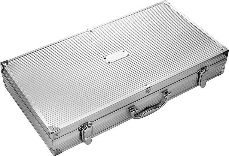 Gril z nehrdzavejúcej ocele v hliníkovej skrinke s ôsmimi špajdlami, štyrmi pľuvadlami, štetcom, mäkkou kefou, rezbárskym nožom, rezbárskou vidličkou, špachtľou s rezacím nožom a kliešťami.