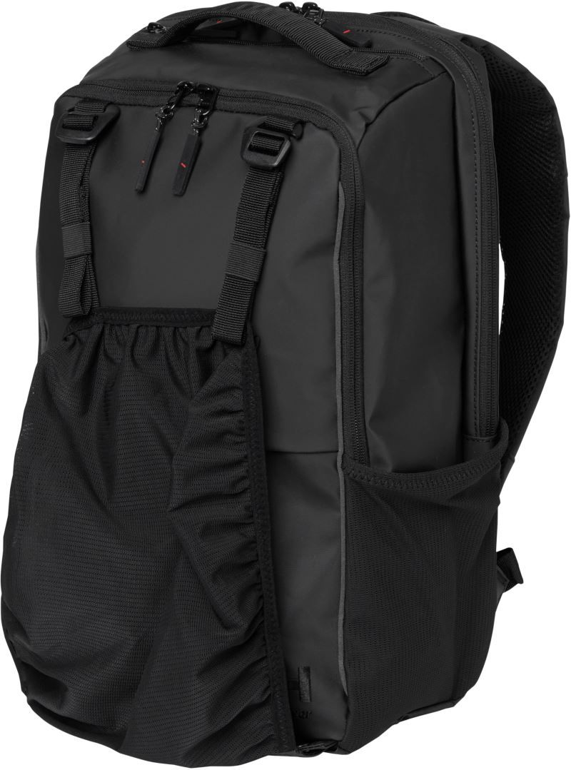Vodeodpudivý materiál, rukoväť, nastaviteľný a polstrovaný ramenný popruh, sieťovina na chrbte a ramenných popruhoch pre lepšie vetranie a komfort, YKK zips, vrecko na doklady, elastické bočné vrecká zo sieťoviny, predné vrecko na zips, vnútri sieťované vrecko, polstrovaný obal pre laptop, vel detaily, rozmery: 42x27x17cm.