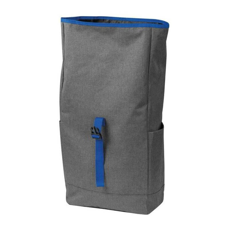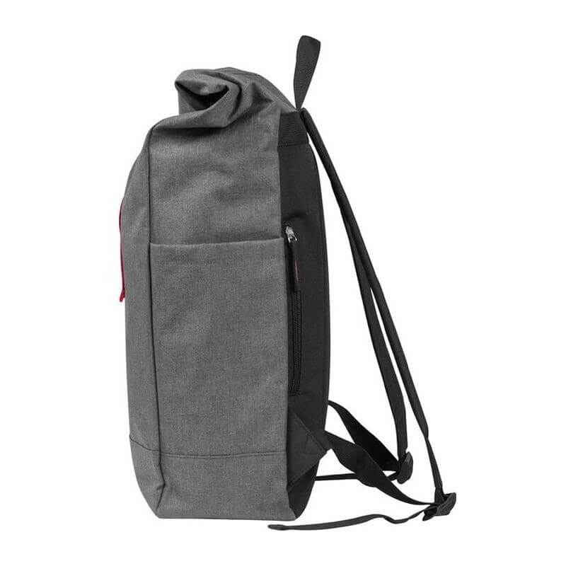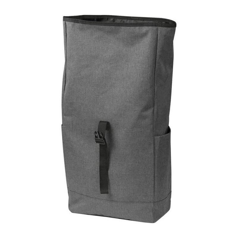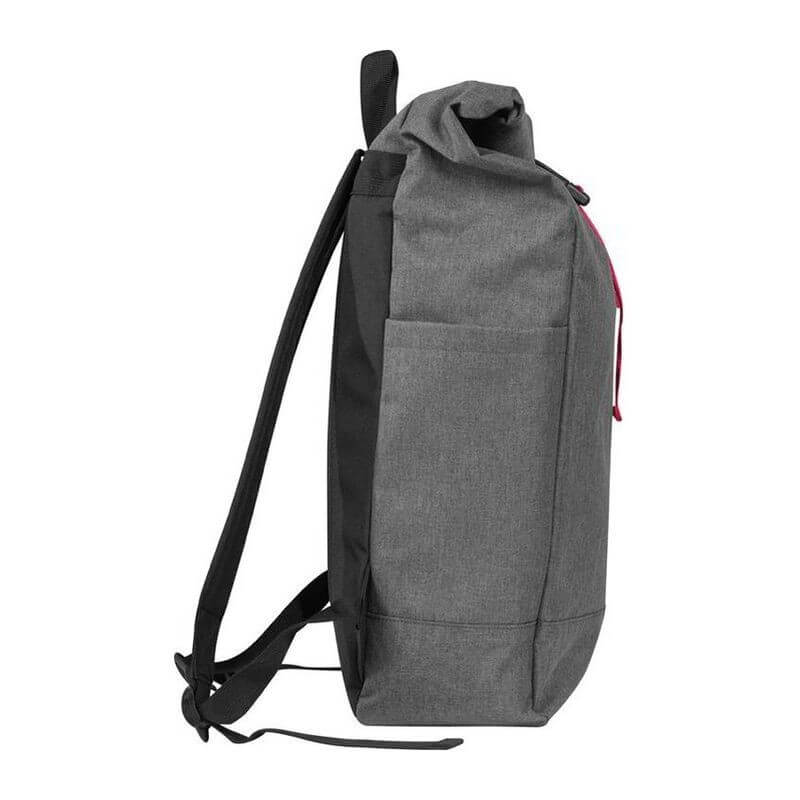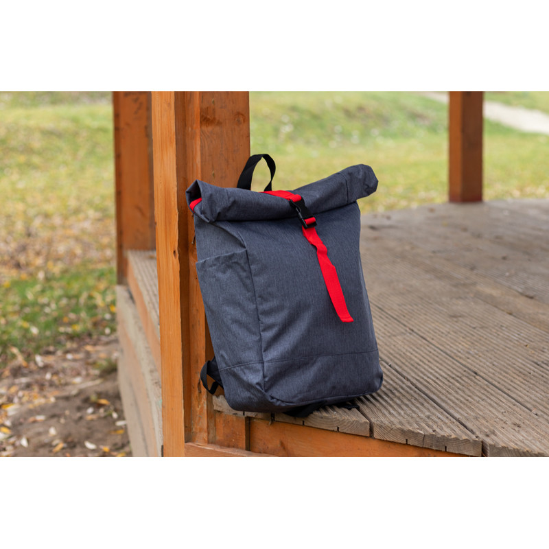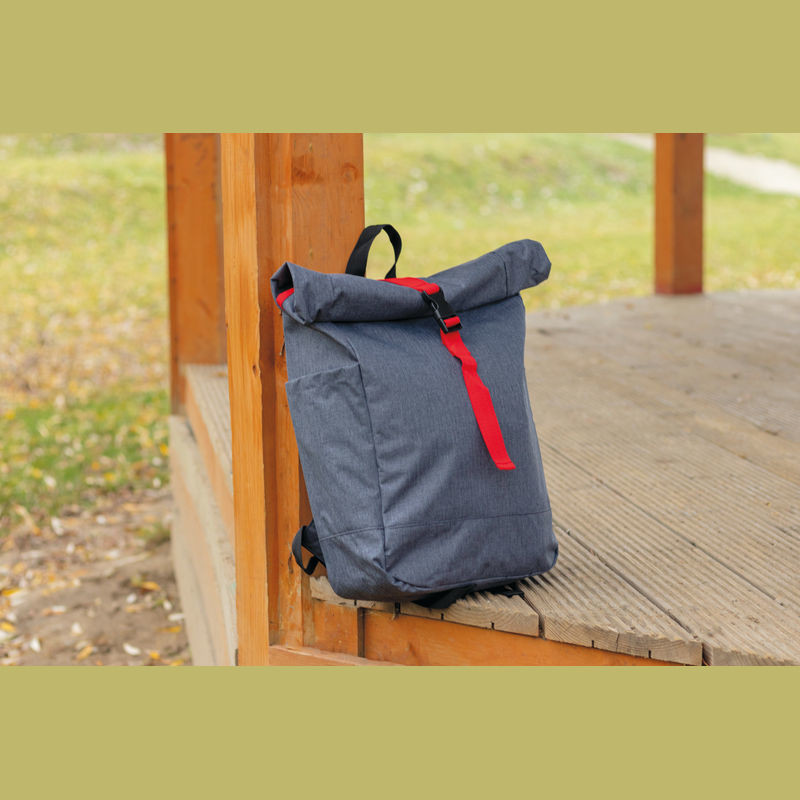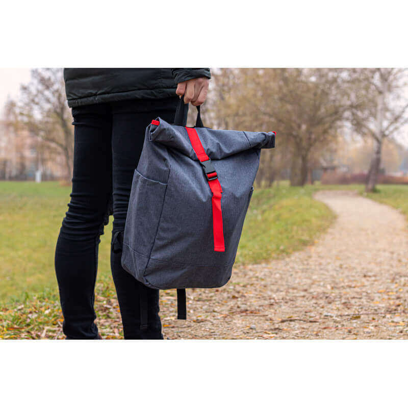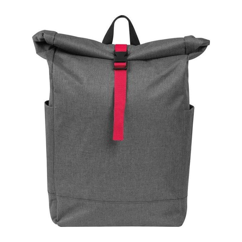 Štýlový batoh v sivej farbe zvýraznený farebným pásom na uzavretie, s vystuženými popruhmi z polyesteru. Batoh sa dá bezpečne uzavrieť jednoduchým skrútením alebo naskladaním.