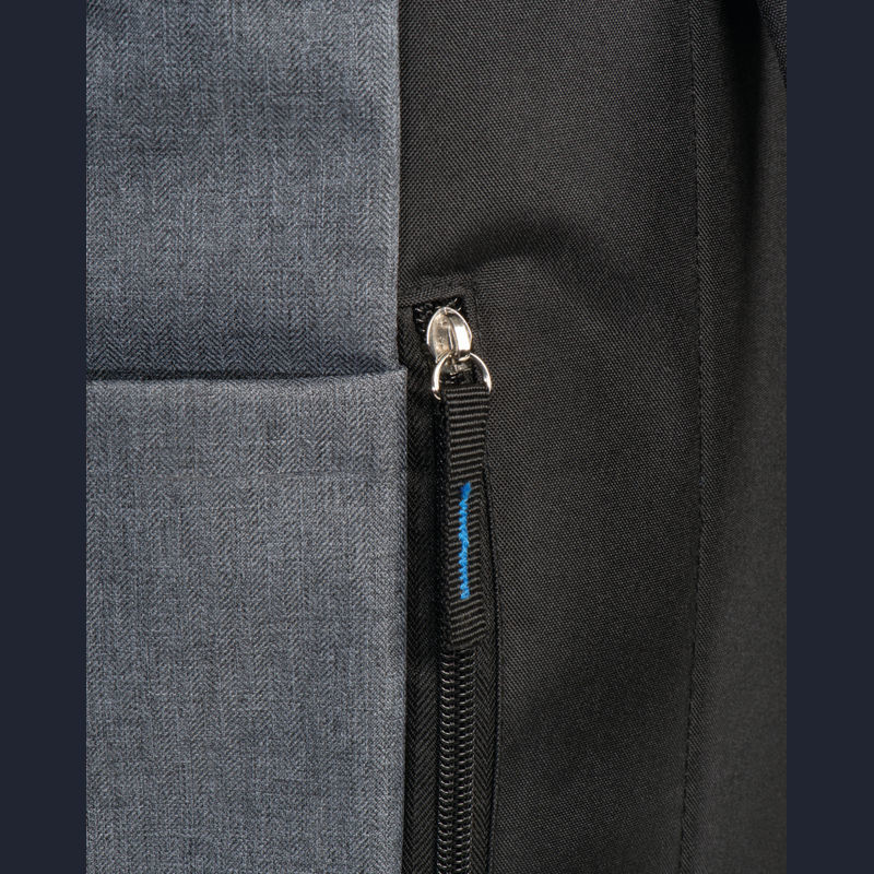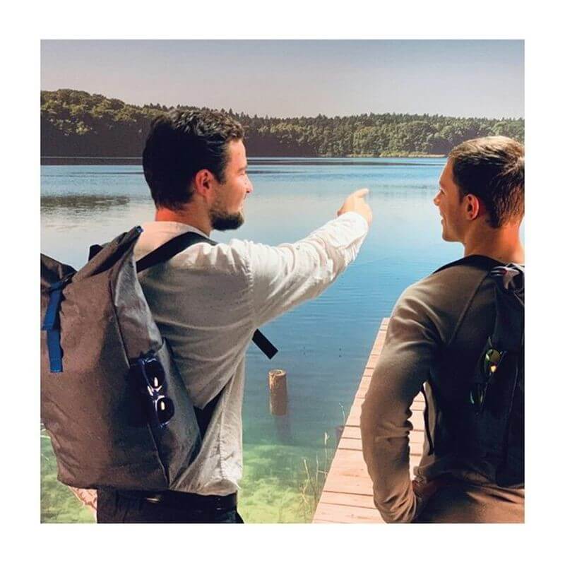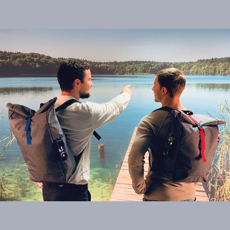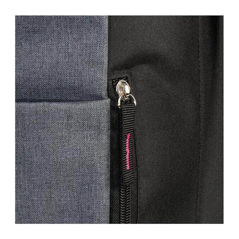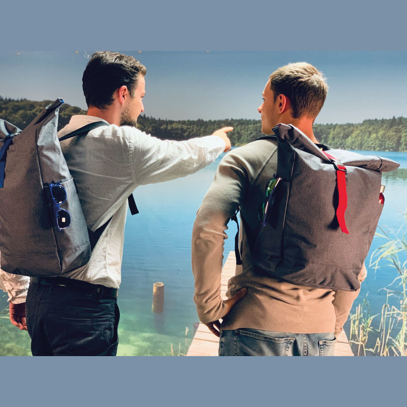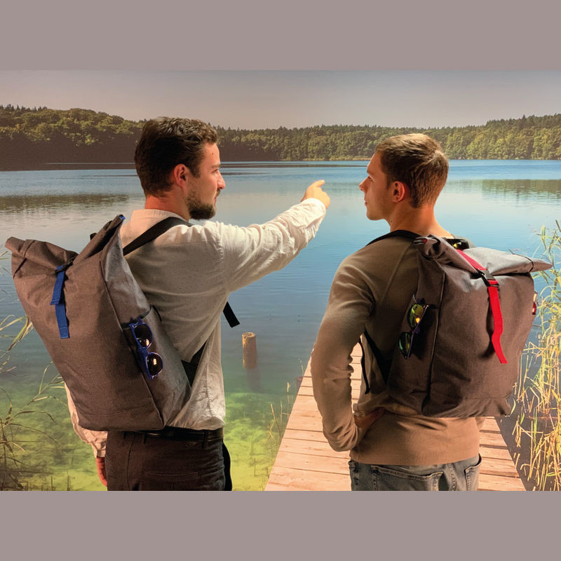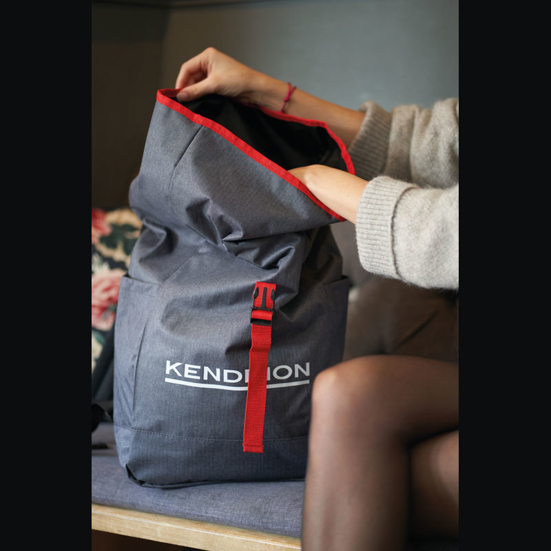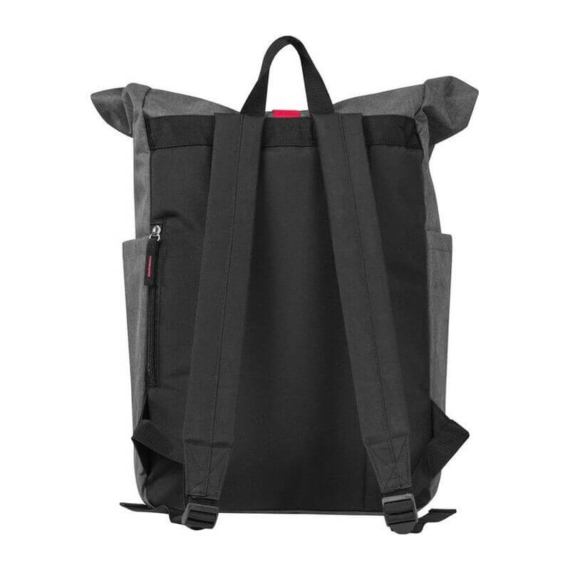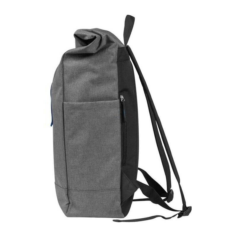 Štýlový batoh v sivej farbe zvýraznený farebným pásom na uzavretie, s vystuženými popruhmi z polyesteru. Batoh sa dá bezpečne uzavrieť jednoduchým skrútením alebo naskladaním.