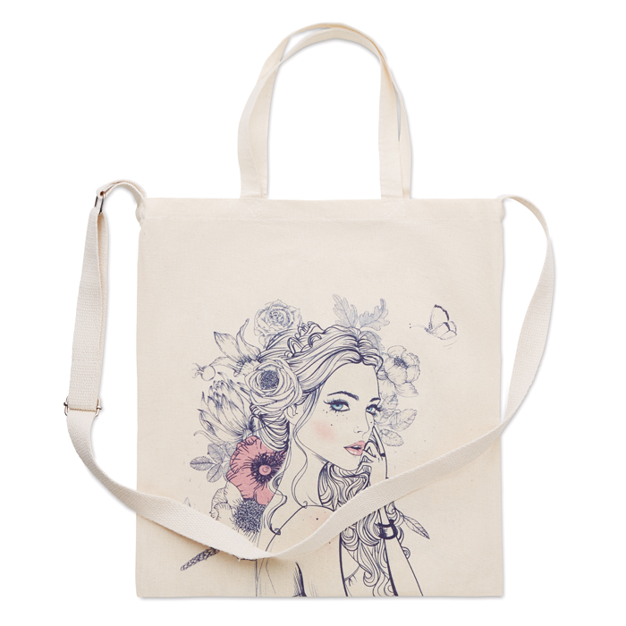 Bavlnená taška na mieru s popruhom cez rameno. Pridajte voliteľnú kovovú pracku, aby ste si mohli nastaviť dĺžku popruhu. Rozmery tašky: 33x36cm; Ramenný popruh: 110 x 2,5 cm. Upozorňujeme, že nie je možné kombinovať sieťotlač a digitálne vytlačené vzory. Základná farba prírodná (bambus biela).
