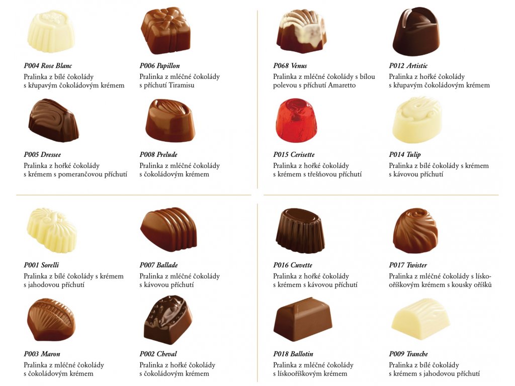 Zloženie: cukor, rastlinný tuk (palmový a kokosový), kakaové maslo, kakaová hmota, maslový olej, sušené plnotučné mlieko, lieskové orechy, laktóza, odstredený kakaový prášok, sušená srvátka (z mlieka), bezvodný mliečny tuk, prírodné arómy (vanilka, káva, čerešne, írská káva, tiramisu, jahoda, amaretto, pomaranč), ryžová múka, dextróza, emulgátor (sójový lecitín), farbivo E162, pšeničný glutén, pšeničný slad, soľ. Informácie pre alergikov: Obsahuje mlieko, sóju, lieskové orechy, pšeničný lepok. Môže obsahovať stopy lieskových orechov, mandlí a vajec. Obsah kakaovej hmoty: najmenej 53 % v horkej čokoláde, najmenej 34,1 % v mliečnej čokoláde, najmenej 27 % v bielej čokoláde.