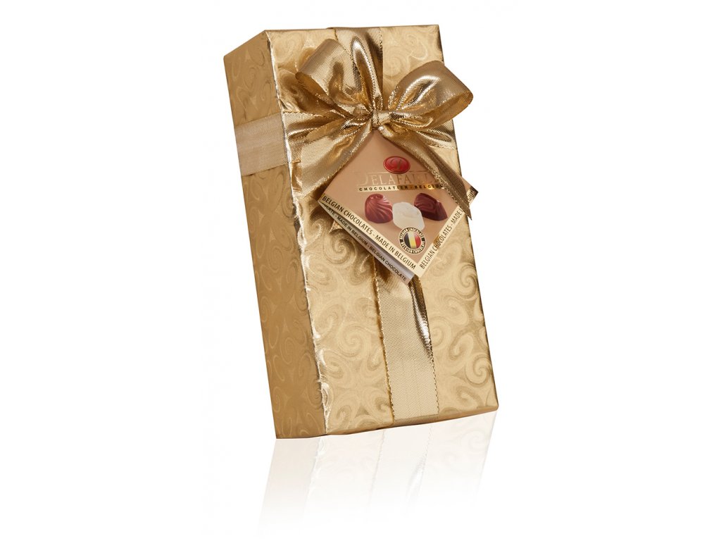 Luxusná bonboniéra obsahuje 16 plnených belgických praliniek z mliečnej, horkej a bielej čokolády. Pralinky sú starostlivo zabalené v elegantnej zlatej krabičke so zlatou stuhou, vďaka čomu sú ideálnym darčekom pre všetkých milovníkov kvalitnej čokolády. Nájdete v nej 8 ks mliečnych praliniek, 4 ks z horkej čokolády a 4 ks z bielej čokolády.