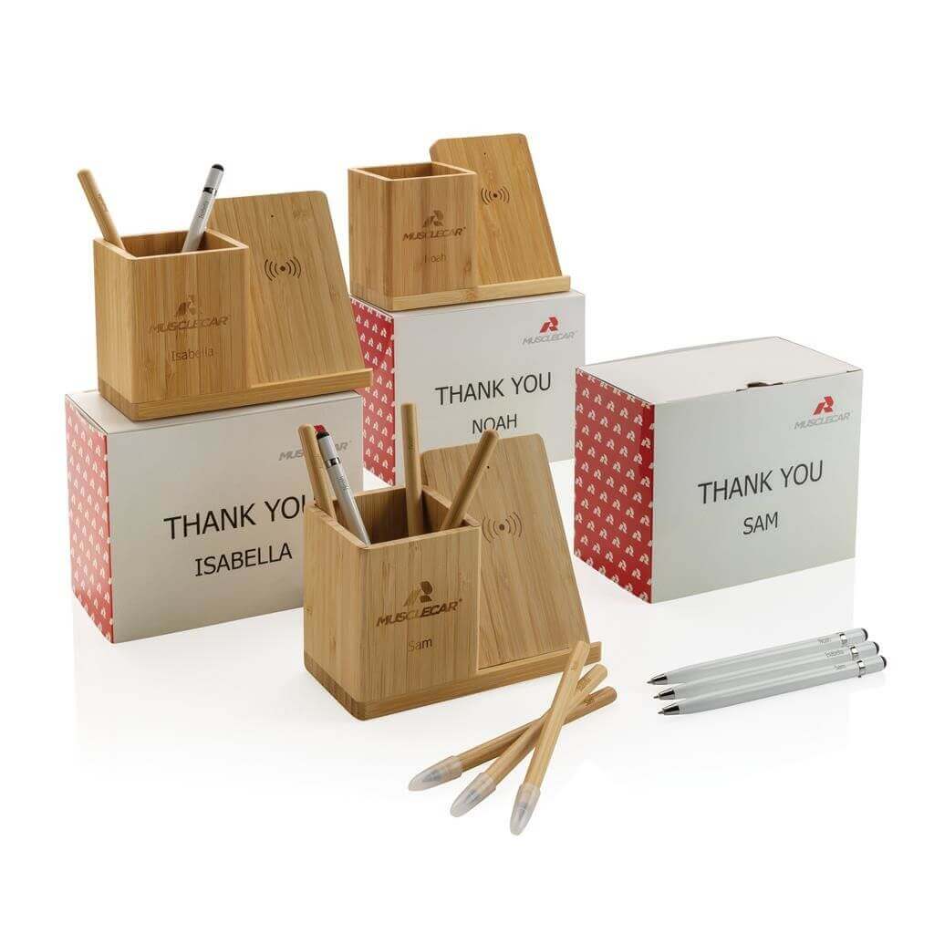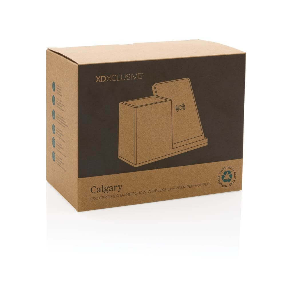 Rýchla bezdrôtová nabíjačka s výkonom 10 W so stojanom na perá. Plastové časti vyrobené z RCS recyklovaného ABS. RCS (Recycled Claim Standard) je globálny štandard, ktorý umožňuje overiť použitie recyklovaného materiálu v produkte naprieč celým dodávateľským reťazcom. Celkový podiel recyklátu podľa váhy produktu: 6 % (vr. váhy bambusu). Vonkajšie časti vyrobené zo 100% FSC® bambusu. Vrátane 120 cm USB C nabíjacieho kábla z RCS recyklovaného TPE. Kompatibilný so všetkými zariadeniami podporujúcimi Qi ako sú najnovšie generácie Android a iPhone 8 a vyššie. USB vstup C: 5V/2A, 9V/1,67A. Bezdrôtový výstup: 5V/1A, 9V/1,1A 10 W. Balené v FSC® darčekovej krabičke. Ochranný vzor®.