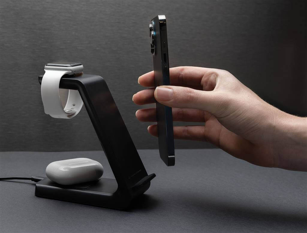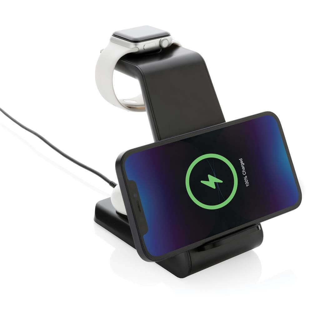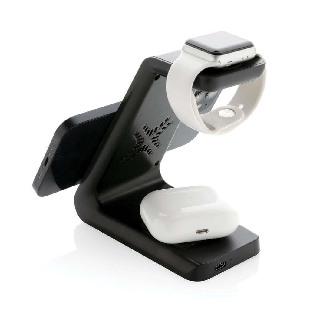 Univerzálna bezdrôtovo nabíjacia stanica pre až 3 zariadenia. Časť určená pre telefón je vybavená duálnou cievkou s najvyšším možným výkonom 15 W, dodatočná plocha pre ďalší telefón alebo slúchadlá s výkonom 5 W na zadnej strane, závesná časť určená pre iWatch s výkonom 3 W. Vyrobené z RCS recyklovaného ABS plastu. RCS (Recycled Claim Standard) je globálny štandard, ktorý umožňuje overiť použitie recyklovaného materiálu v produkte naprieč celým dodávateľským reťazcom. Celkový podiel recyklátu podľa váhy produktu: 60 %. Vrátane 120 cm USB C nabíjacieho kábla z RCS recyklovaného TPE. Produkt aj príslušenstvo bez PVC. Balené v darčekovom balení Urban Vitamin s minimálnym obsahom plastov. Vstup: 5V/3A, 9V/2A, 5V/1A, 9V/1.1A.