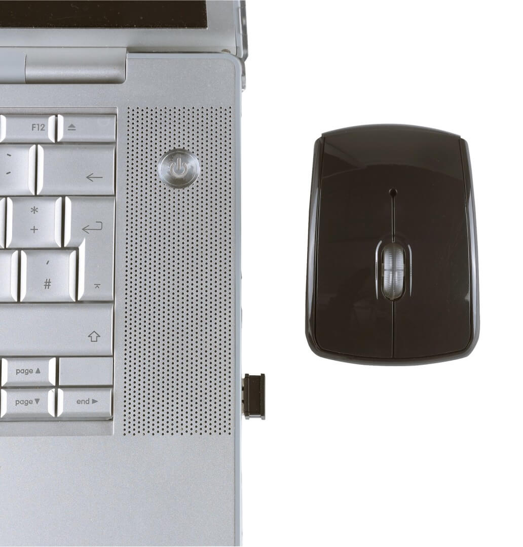 Bezdrôtová optická myš SINUO: 2 tlačidlá a koliesko, USB dongle pripojený k spodnej strane s magnetom, rozlíšenie: 800 / 1.600 dpi, dosah: až 10 m, Plug & Play (bez nutnosti softvéru), batérie: 2 x AAA (nie sú súčasťou balenia.)