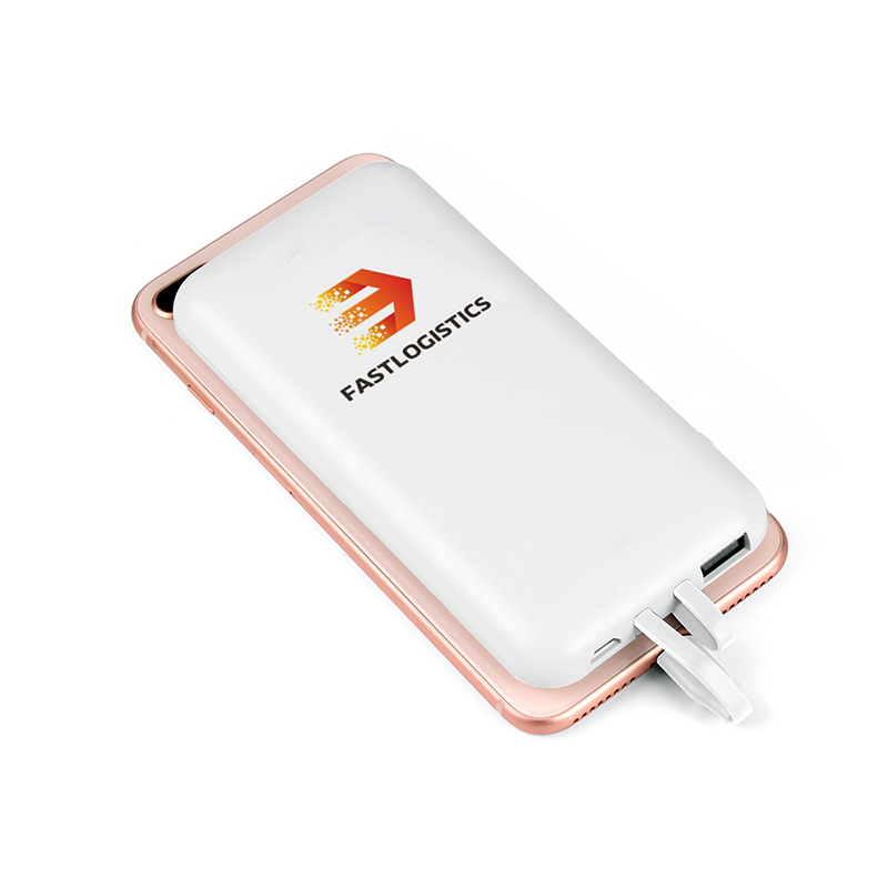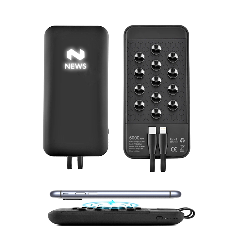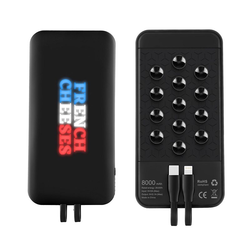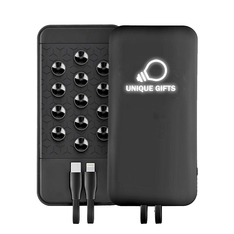 Bezdrôtová powerbanka s integrovanými káblami a prísavkami je vybavená bezdrôtovou technológiou a batériou s kapacitou 8000 mAh. Zabezpečuje okamžité dobitie vašich zariadení bez použitia káblov. Svoje zariadenia môžete začať nabíjať jednoduchým položením na power banku. Dokáže nabíjať rôzne typy smartfónov. Obsahuje zabudované napájacie káble Type-C a Lightning (iPhone). Prísavky jednoducho a pevne pripevnia nabíjané zariadenie a externú batériu k sebe. Čiernu verziu powerbanky možno doplniť efektným bielym LED logom a bielu verziu farebnou potlačou. Obe verzie majú svoje osobité čaro.