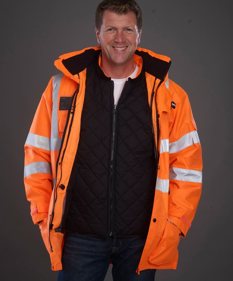 Vodoodolný, priedušný materiál, odnímateľná kapucňa, náprsné vrecko, podlepené švy, zips vo vnútri na pripevnenie vnútornej bundy, certifikované podľa normy EN ISO 20471:2013 trieda 3, zaručené reflexné vlastnosti podľa normy EN - 25 praní, možnosť prania na 40°, vnútorná bunda: odnímateľné rukávy, po 2 vonkajšie a vnútorné vrecká, možnosť nosenia na oboch stranách, certifikovaná podľa normy EN ISO 20471 trieda 2