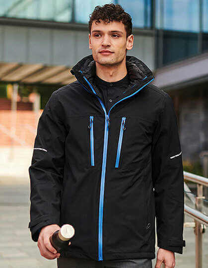 Nepremokavý a priedušný strečový materiál Isotex 10 000 na vonkajšom odeve vyhovuje norme EN343 3: 2, utesnené švy a povrchová úprava DWR (odolná a vodoodpudivá) pre ochranu za každého počasia | Ochranné vrecká RFID blokujú skenery, a tým chráni vaše údaje a znižujú riziko digitálnej krádeže | Plne izolovaná vnútorná bunda s panelom s termoreflexnou podšívkou udržiava teplo | Zbaliteľná kapucne, ktorú možno schovať do goliera | 2 spodné vrecká na zips a 2 vodeodolné náprsné vrecká na zips | Nepremokavý zips vpredu uprostred | Skrytý zips v podšívke umožňuje prístup k výšivke, Nastavovače - pružné šnúrky pri tvári a na leme | Reflexné prvky na rukávoch a na chrbte