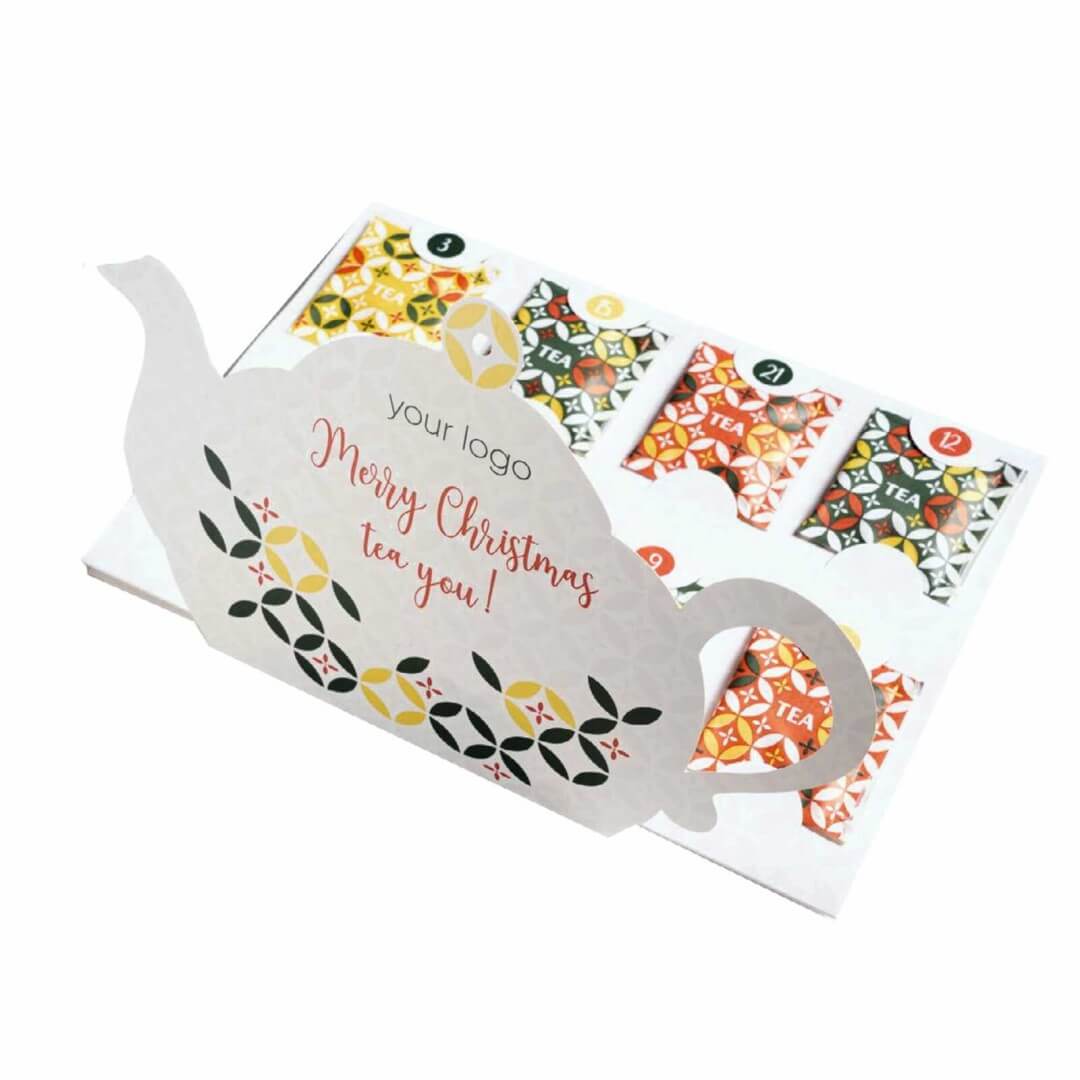 Spríjemnite čakanie na Vianoce jedinečným čajovým advetným kalendárom. Čajový adventný kalendár obsahuje mix 24 čajových vrecúšok. Z kalendára si môžete vychutnať čierny čaj Earl Grey, čierny čaj s malinovou a citrónovou kôrou, čierny čaj so zázvorom, kardamónom a pomarančovou kôrou. Obal je možné digitálne potlačiť. Od výroby majú čaje spotrebu 12 mesiacov.