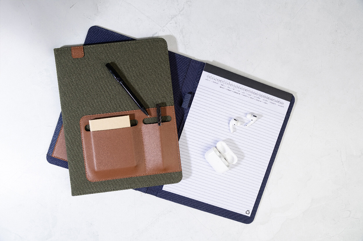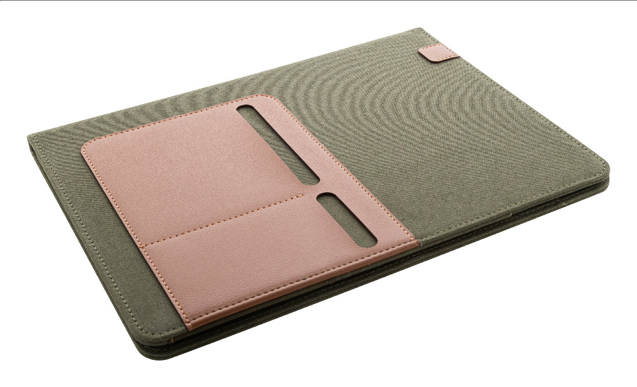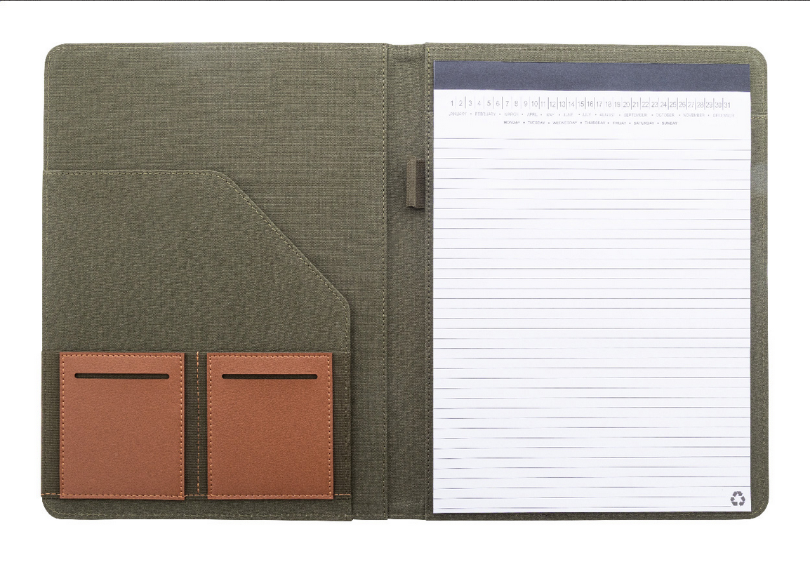 Zložka na dokumenty A4 z recyklovaného plátna a recyklovanej umelej kože s niekoľkými prednými a vnútornými vreckami. S blokom na 20 linkovaných listov z recyklovaného papiera. 70% recyklovanej bavlny a 30% RPET polyesteru. New. Go Green. Formát veľkosti: A4. Typ zošitového papiera: Linkované listy