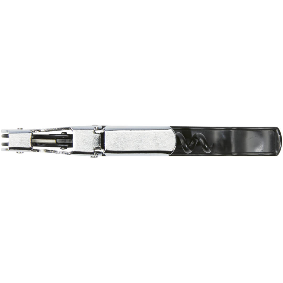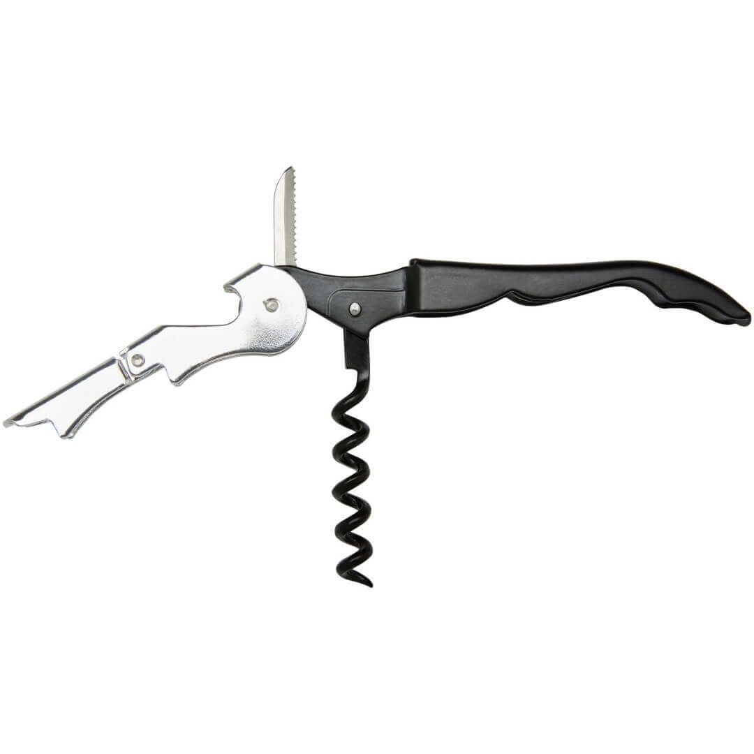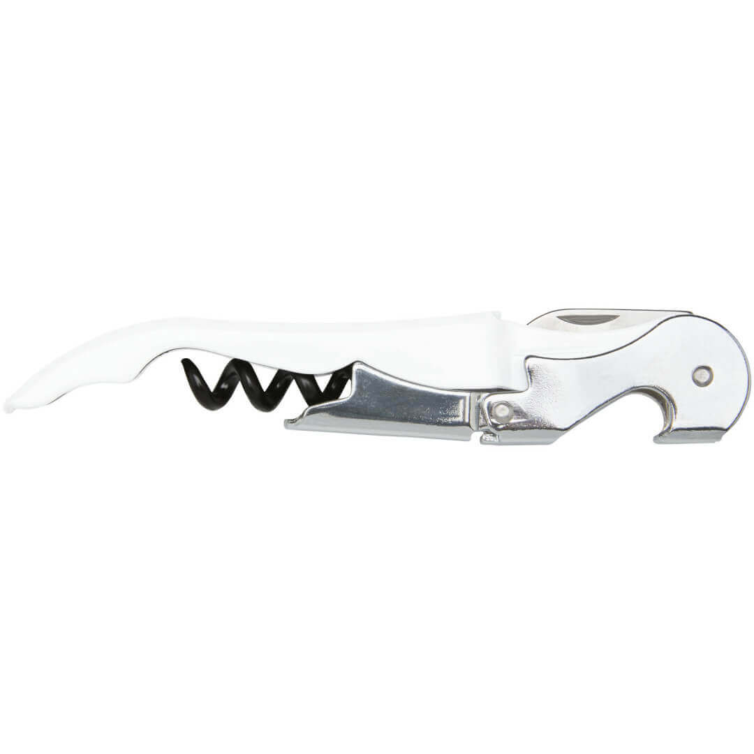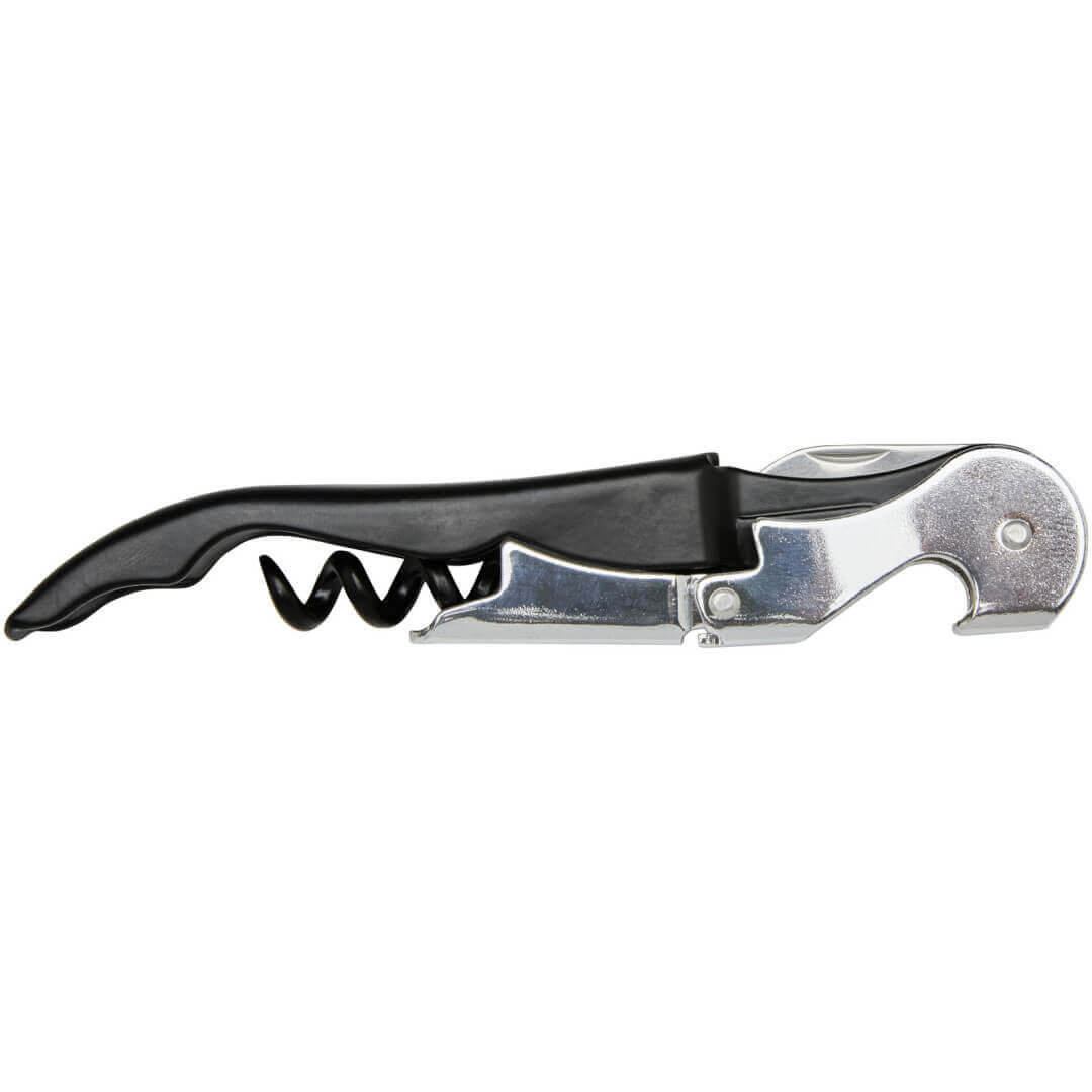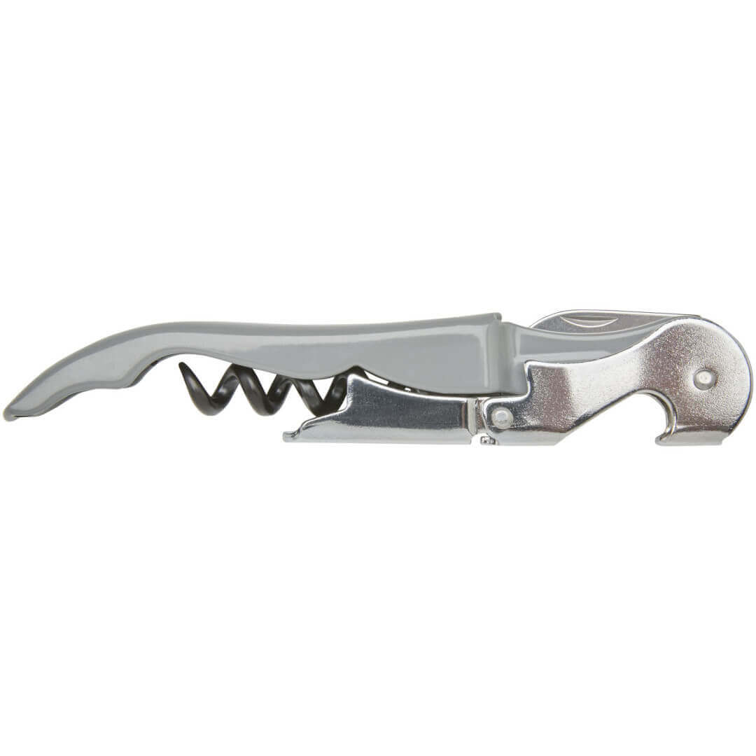 Nerezový čašnícky otvárač s farebným telom s vývrtkou, rezačkou fólie a otváračom na fľaše. Vďaka dvojstupňovej konštrukcii je možné ľahko vytiahnuť zátku z fľaše.