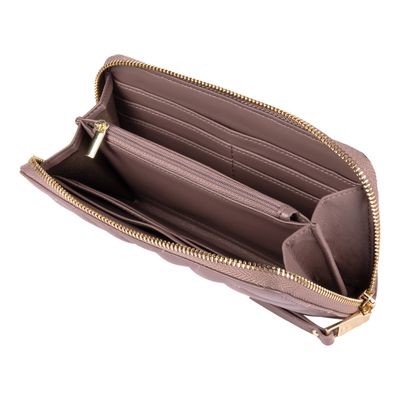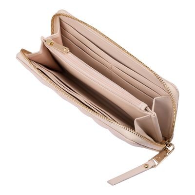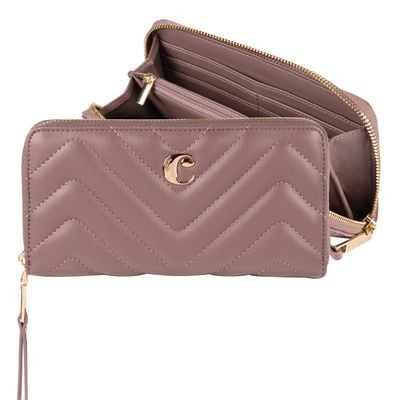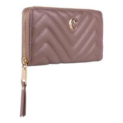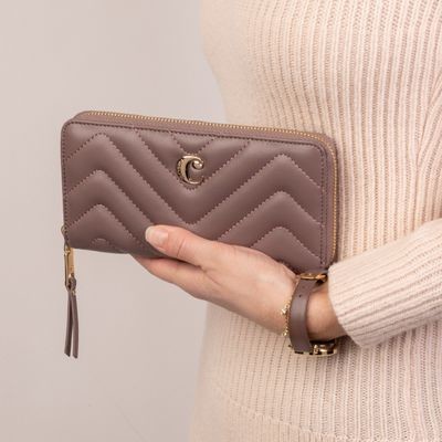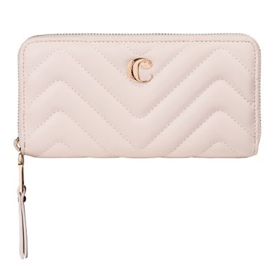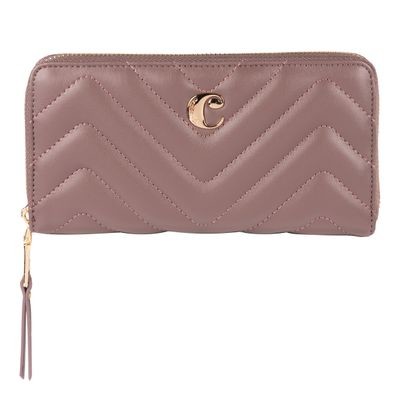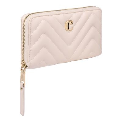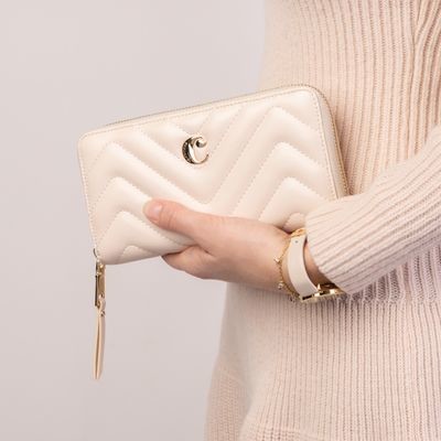 Dámska peňaženka "Odeon" je elegantná a decentná s prešívaným vzorom na krásnej, jemne textúrovanej vegánskej koži (PU). Podpisový štítok je mierne nadrozmerná a klenutá verzia ikonického loga „C“, podpísaná rytinou Cacharel. Sťahovák zipsu je tiež podpísaný ikonickým logom „C“ a je vyrobený z krásneho pozláteného kovu zmiešaného s vegánskou kožou, čo dodáva celému produktu krásny ženský nádych. Peňaženka je klasického formátu s potulným a organizovaným vnútrom s najmenej 8 priehradkami na karty, priehradkami na bankovky a priehradkou na zips v strede. Pre tento rad Odeon sme chceli ponúknuť neutrálne a nadčasové tóny, zakončené zlatými akcentmi pre luxusný pocit.