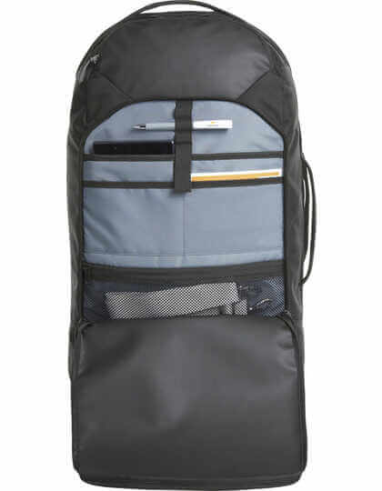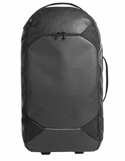 Vypracovaný kufor na kolieskach s reflexným lemovaním. Hlavná priehradka s obojsmerným zipsom na troch stranách. Vrchná časť hlavného priestoru s oddeľovačom na zips. Dno hlavného priestoru s elastickými pásikmi. Malé predné vrecká na zips.