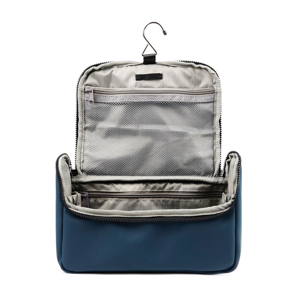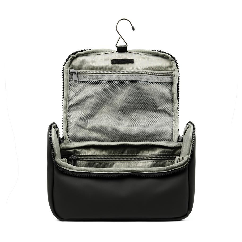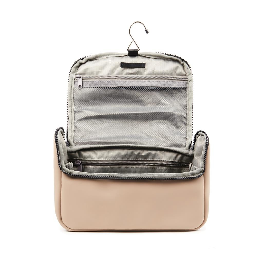 Cestovná toaletná taška vyrobená z vodou repelentnej nubukovej PU kože, ktorá je zároveň štýlová aj praktická. Materiál je veľmi ľahko umývateľný. Vnútorná časť je prispôsobená pre maximálnu organizáciu všetkých toaletných potrieb. Disponuje niekoľkými vreckami a háčikom na zavesenie.