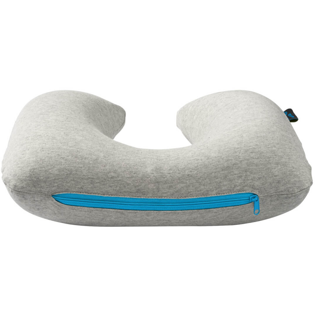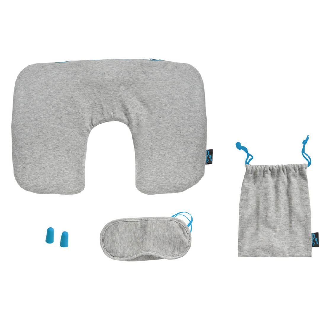 Cestovná žeržejová sada Miami. Mäkká cestovná sada obsahuje nafukovací šijový vankúšik so svetlomodrými zipsom, masku na oči sa svetlomodrou elastickou páskou, svetlomodré upchávky do uší a mäkké púzdro sa svetlomodrou sťahovacou šnúrkou. Žerzej.