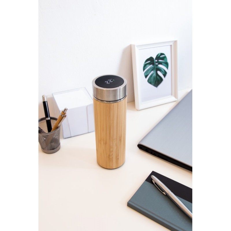 Cestovný izolovaný hrnček BAMBOO TEMP, dvojstenný: zvnútra a zvonka z nehrdzavejúcej ocele, zvonka potiahnutý bambusom, bezpečné šróbovacie viečko so silikónovým O-krúžkom a integrovaným digitálnym teplomerom, s odnímateľným sitkom, kapacita cca. 400 ml.