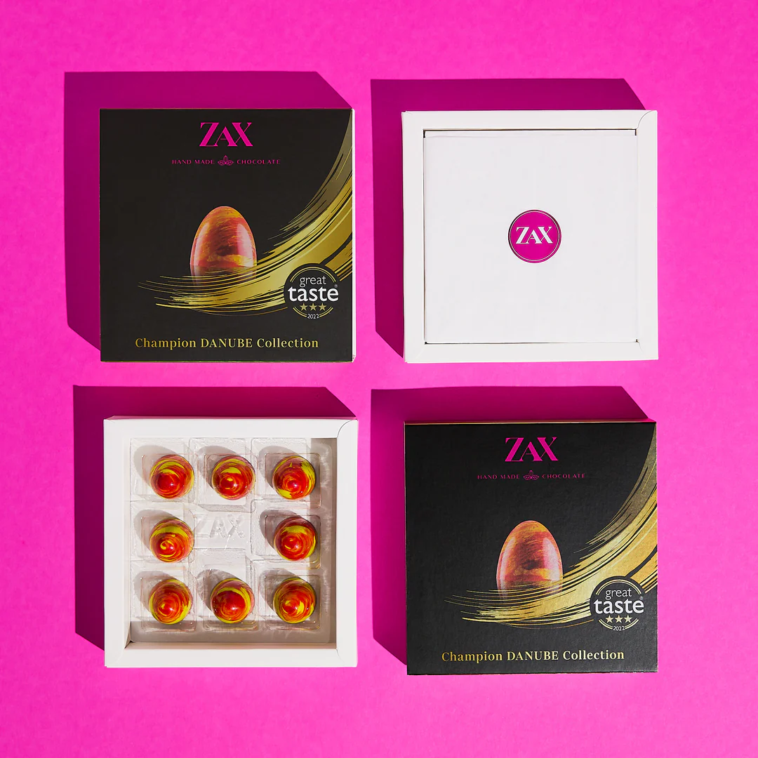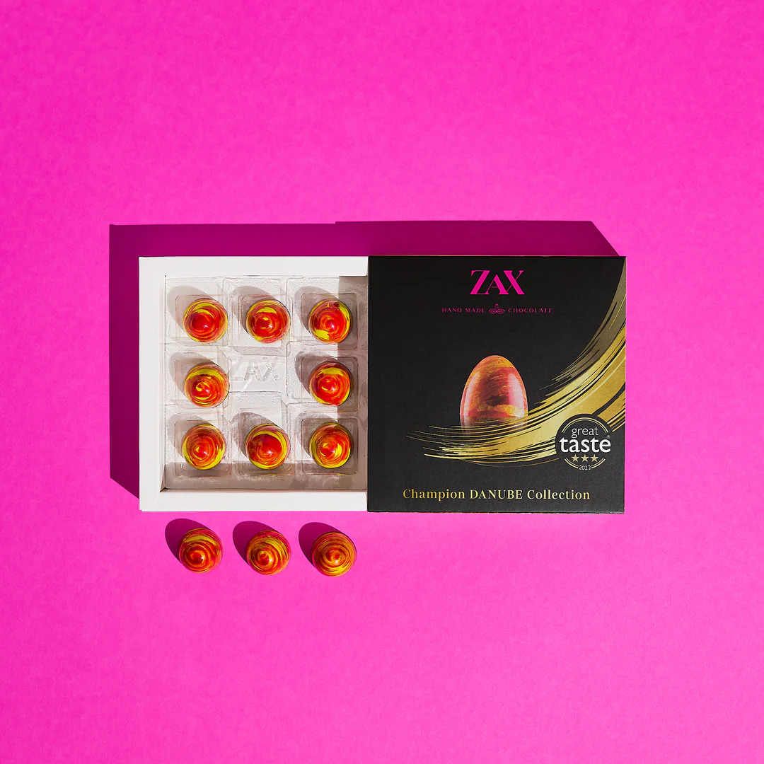 Ocenené pralinky s marakujou, ktoré získali 3 hviezdičky great Taste 2022 a striebro Academy of Chocolate 2020. Prémiová ručne maľovaná bonboniéra ponúka 68% čokoládu s krémovou čokoládou Valrhona Azélia a prírodným marakujovým pyré. Výnimočná harmónia sviežej kyslosti a sladkosti pre jedinečný gurmánsky zážitok. Bez konzervantov, palmového oleja a gMO, vyrobené zo 100% kakaového masla a ovocných pyré. Trvanlivosť: 6 týždňov. Rozmer: 140 × 140 × 30 mm. Váha: 70 g
