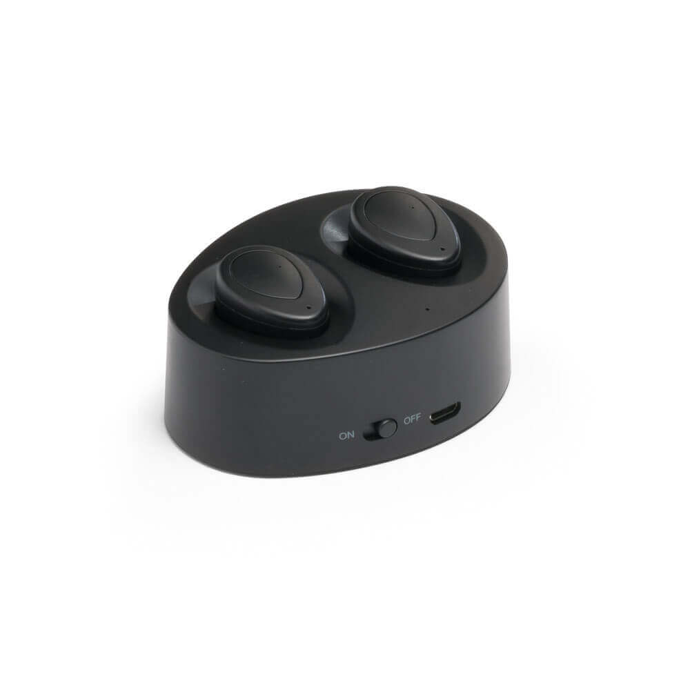 Bezdrôtové zátkové slúchadlá z ABS, ktoré umožňujú Bluetooth prenos a samostatnú prevádzku až 6 hodín. Slúchadlá CHARGAFF vám umožňujú prijímať telefónne hovory, ovládať hlasitosť a pripojiť sa k zoznamu skladieb mobilného zariadenia. Zahŕňajú USB/microUSB kábel na nabíjanie a sú dodávané s nabíjacou základňou v darčekovej krabičke. Slúchadlo: 27 x 20 x 28 mm | Základňa: 77 x 60 x 29 mm | Krabička: 83 x 83 x 40 mm