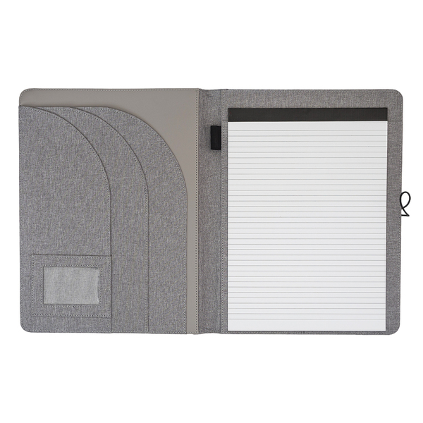 Zakladač na dokumenty formátu A4 s obalom z recyklovaného polyesteru (RPET). Obsahuje zošit s riadkovaním, tri veľké priehradky, vrecko na vizitky a držiak na pero. Zakladač sa uzatvára elastickým popruhom upevneným kovovým háčikom.