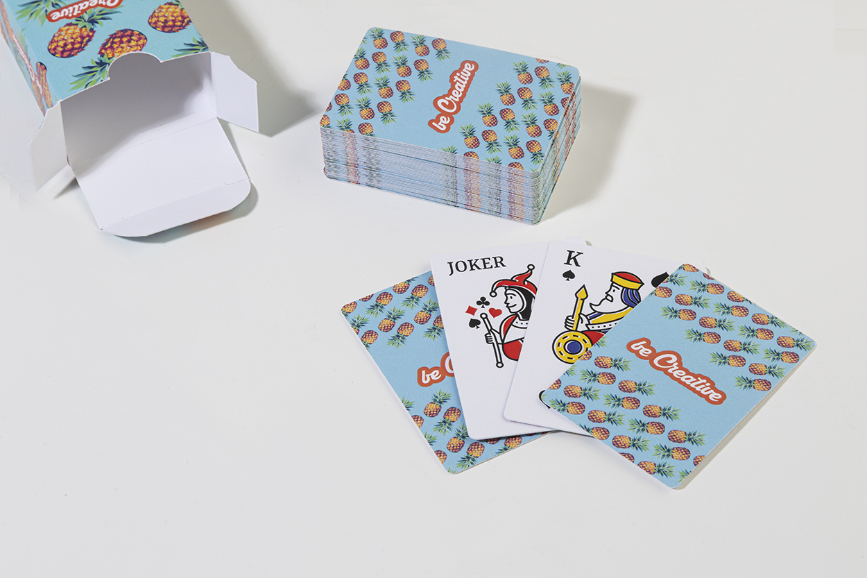Cestovné miniatúrne klasické hracie karty v papierovej krabičke na zákazku. Jeden štandardný balíček s 54 kartami. Cena zahŕňa farebne potlačenú krabičku a identickú farebnú potlač na zadnej strane každej karty, cena nezahŕňa tlačovú prípravu. Min. mn.: 100 ks. New. Be Creative