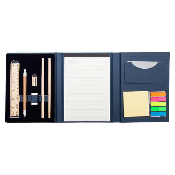 Elegantná kancelárska súprava v lepenkovom obale 1200 g/m2. Vnútri: drevené pravítko, guličkové pero, guma, strúhadlo, 2 ceruzky; linajkový papier 80 g/m2, 40 listov, 13,7 * 20,7 cm; žltý lepiaci papier: 7,5 * 7,5 cm, 5 farieb lepiacich papierikov z PET 1,2 * 4,5 cm, 25 lístkov každej farby; navyše vrecko s pravítkom.