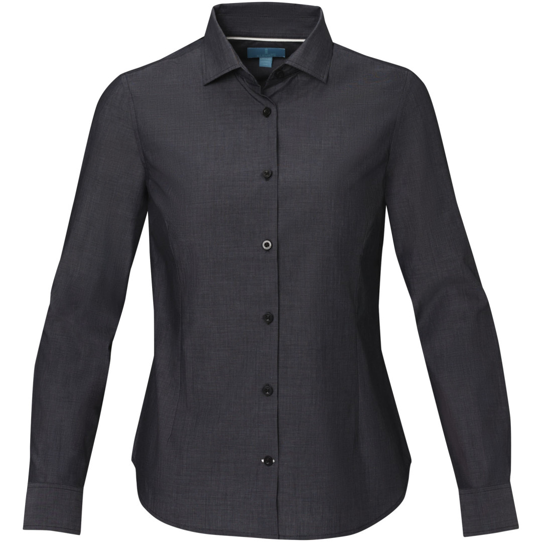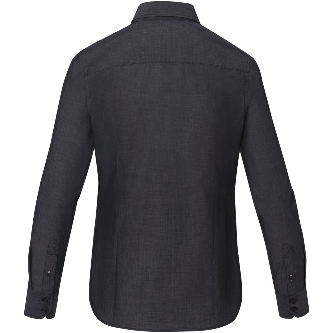 Udržateľné propagačné odevy. Polootvorený golier. Gravírované perleťové gombíky. Nastaviteľná manžeta s jednoduchým záhybom. Saténové lemovanie na vnútornej strane výstrihu. Kontrastné prešitie na manžetách rukávov a spodné gombíkové lézie. Tkaný štítok.