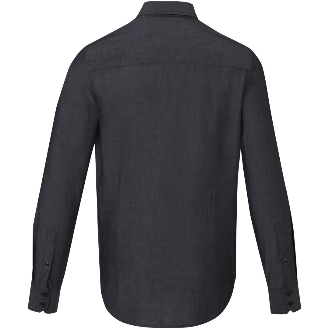 Udržateľné propagačné odevy. Polootvorený golier. Gravírované perleťové gombíky. Nastaviteľná manžeta s jednoduchým záhybom. Saténové lemovanie na vnútornej strane výstrihu. Kontrastné prešitie na manžetách rukávov a spodné gombíkové lézie. Tkaný štítok.