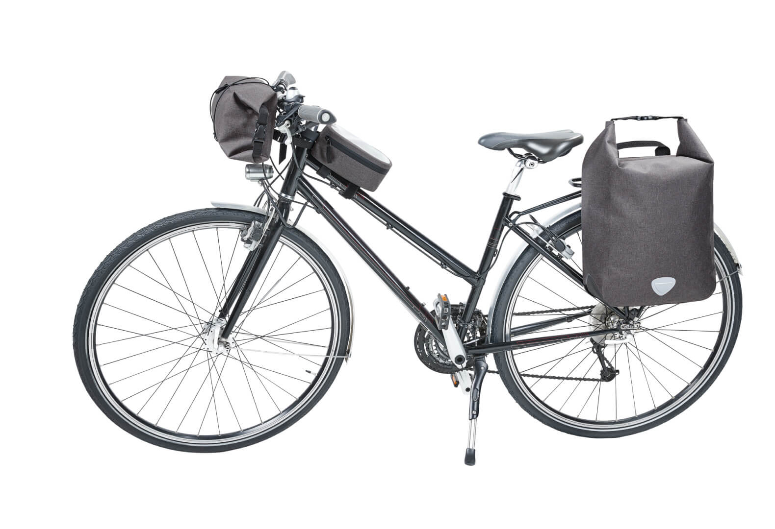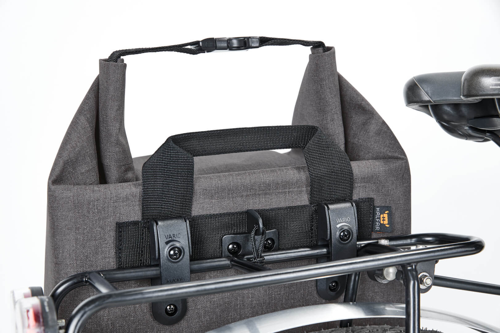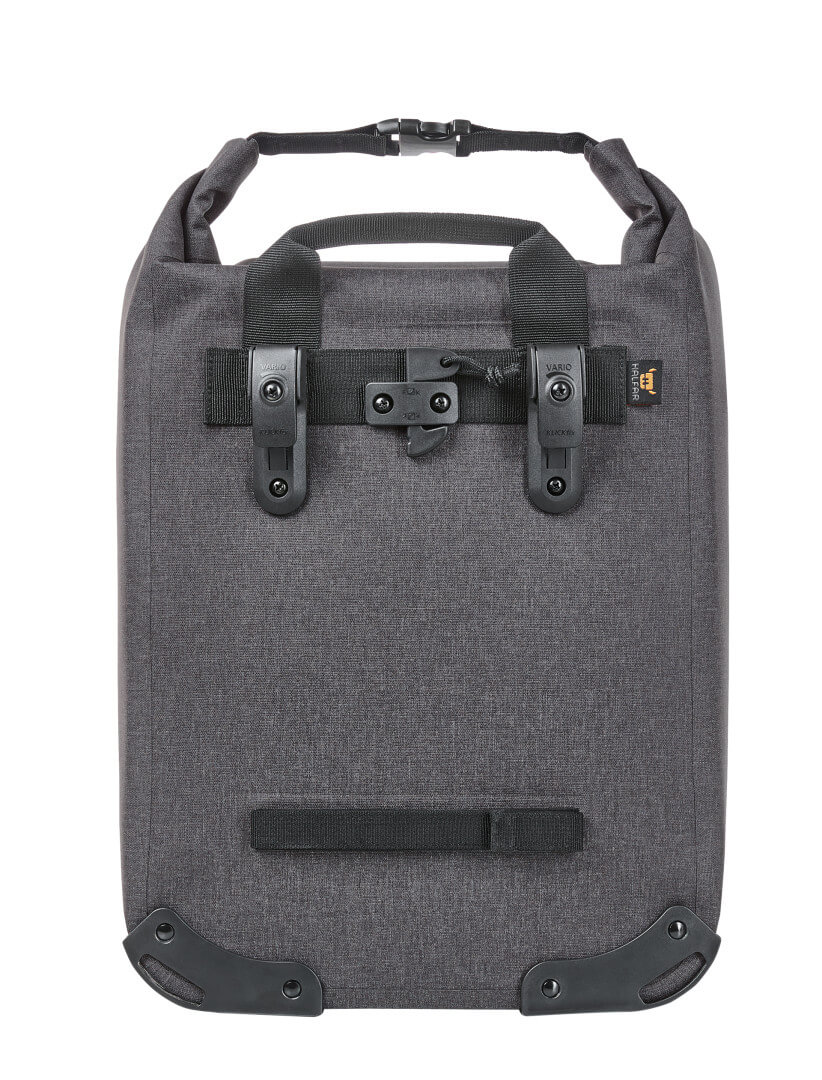 Polyester 600D | Mestská cyklistická taška s priestranným hlavným vreckom | Veľké vnútorné vrecko na zips | Uzatváranie „roll-top“ | Zvárané švy spoľahlivo ochránia proti dažďu a vlhku | Ochrana základne a rohov | Individuálne nastaviteľný držiak na upevnenie na cyklistické tašky s otočným zámkom na zaistenie, klopa na suchý zips naspodku zadnej časti pre ďalšie zaistenie (systém držiakov klickfix®) | Dekoratívna reflexná nášivka | Ucho | Kompatibilný s vložkou na notebook | Vegánske | Obsah/dekorácia nie sú súčasťou balenia