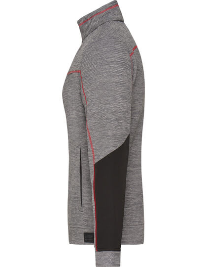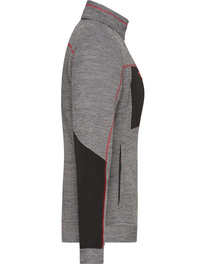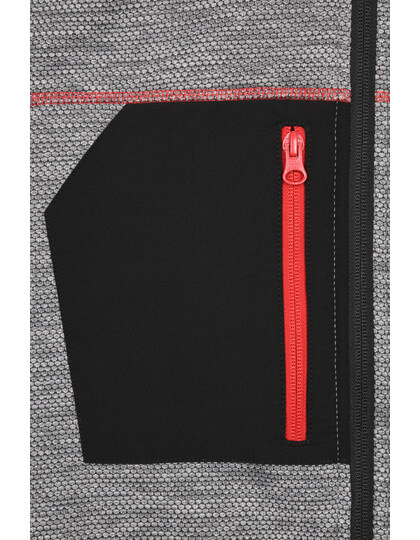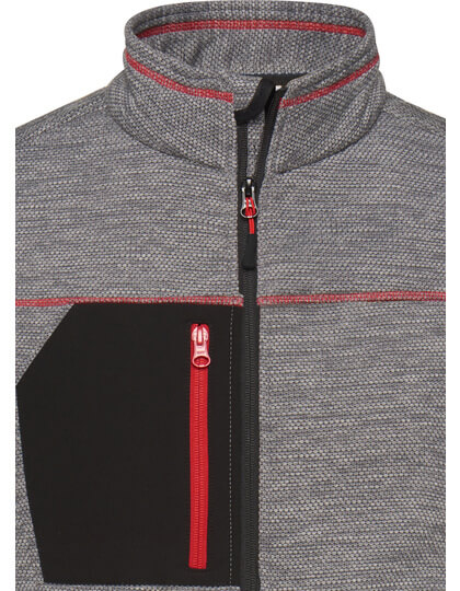 Pletená flisová bunda s ľahkou údržbou | Mäkká, teplá, ľahko udržiavateľná látka v melírovom vzhľade | Vonkajšia strana: Hladký, textúrovaný vzhľad | Vnútorná strana: Mäkký, našuchorený a česaný materiál | Dve bočné vrecká so skrytým zipsom, dve vnútorné vrecká | Náprsné vrecko z tkanej látky s kontrastným zipsom | Kontrastné šitie | stojačik | Po celej dĺžke skrytý zips s ochranou brady | Zipsy: YKK |